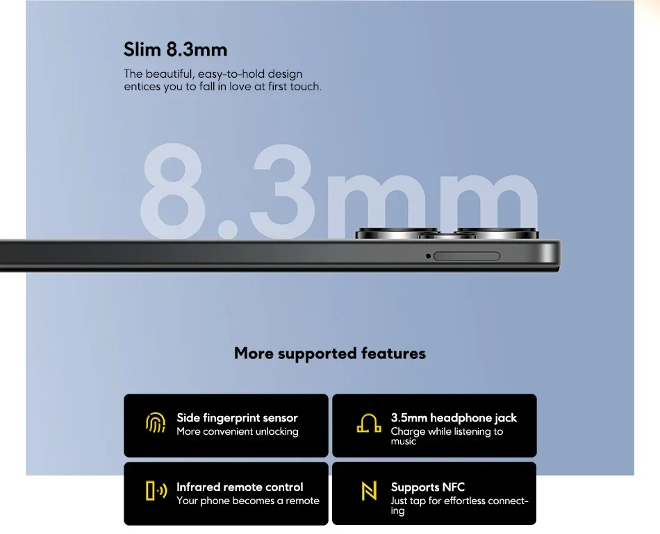 OS -------------- Versión global, compatible con varios idiomas y Google Play,Sensor de huellas dactilares lateral, desbloqueo facial por IA, NFC (* la disponibilidad de NFC puede variar entre mercados)
