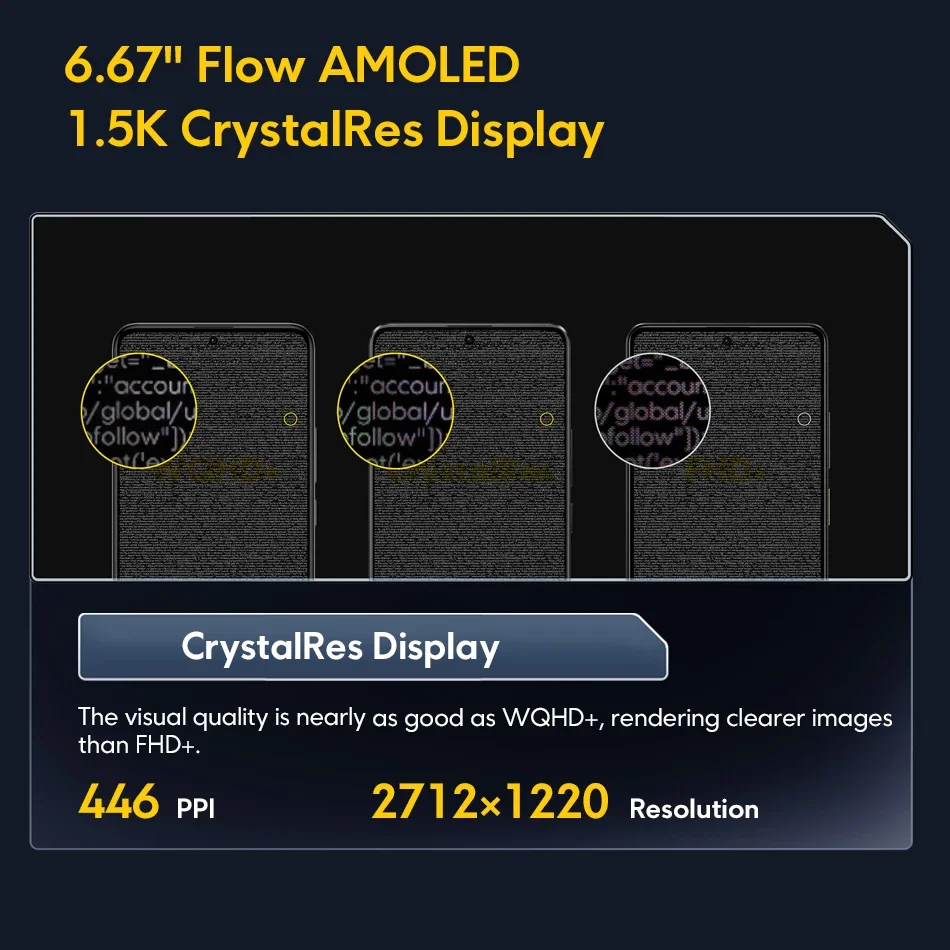 Pantalla----------- 6.67" 2712x 1220, pantalla de punto AMOLED de flujo CrystalRes de 1,5 K, tasa de actualización de 120 Hz