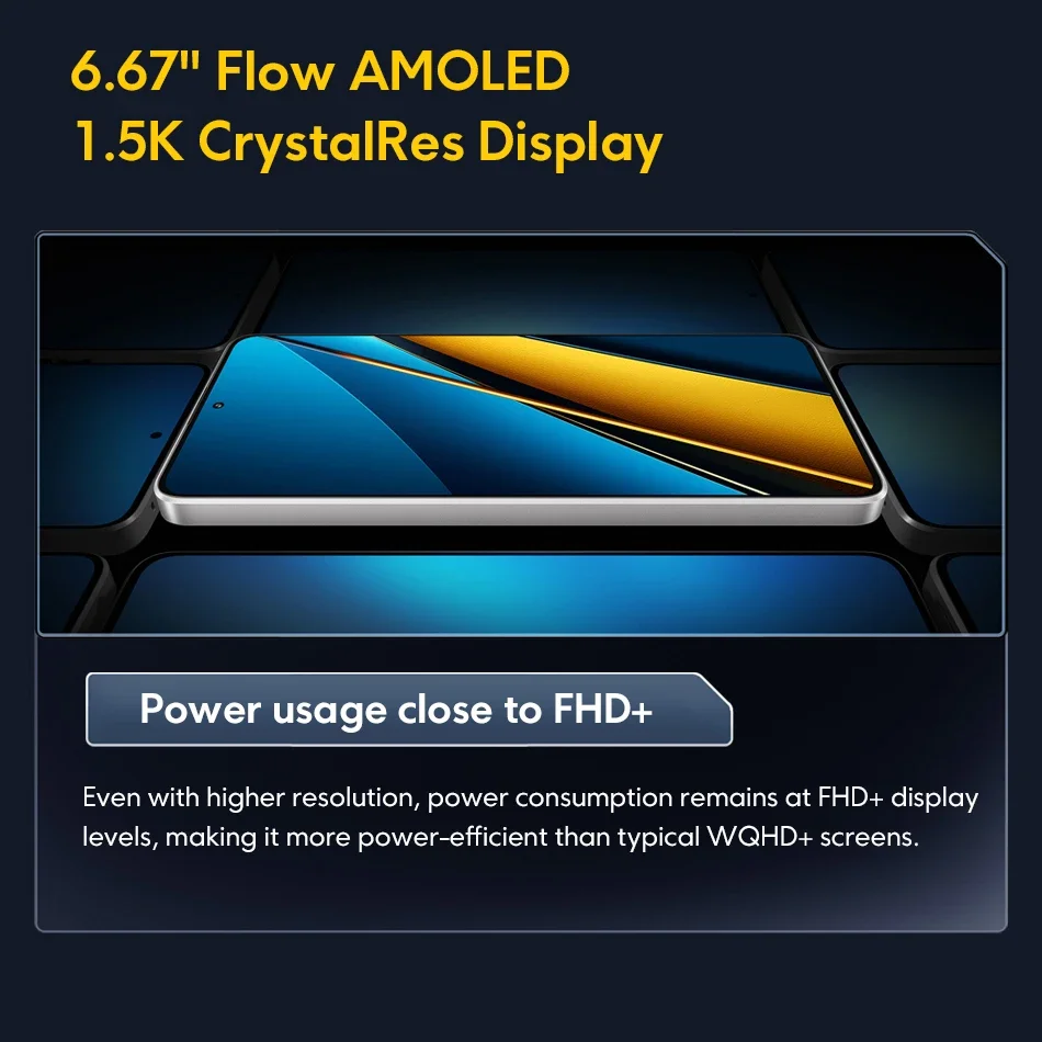 La serie POCO x6 presenta la última pantalla Flow AMOLED de nivel insignia. Con el bisel izquierdo y derecho de solo 1,3 mm* y el bisel inferior de 2,27 mm*, puedes sumergirte como nunca antes.
