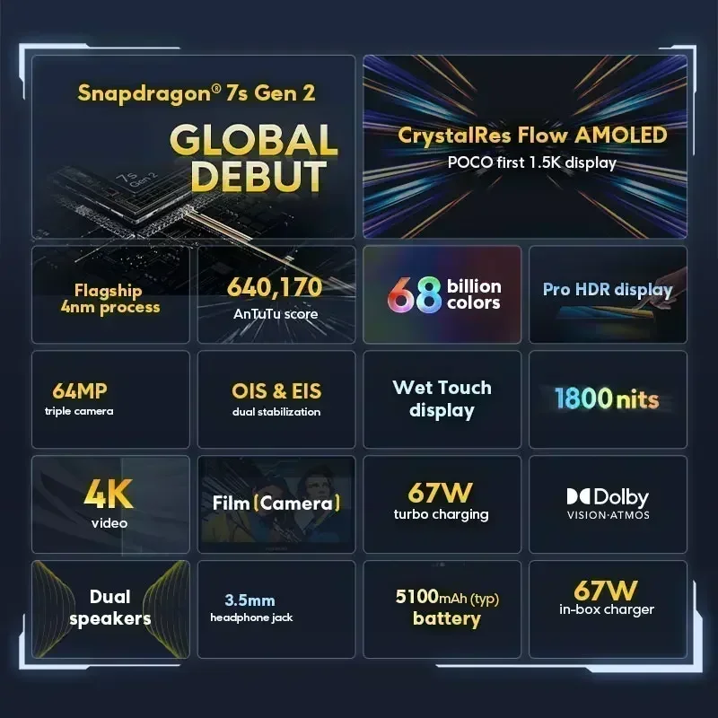 Triple cámara de 64 MP, Snapdragon® 7s Gen 2, pantalla AMOLED de flujo CrystalRes de 120 Hz, carga turbo de 67 W