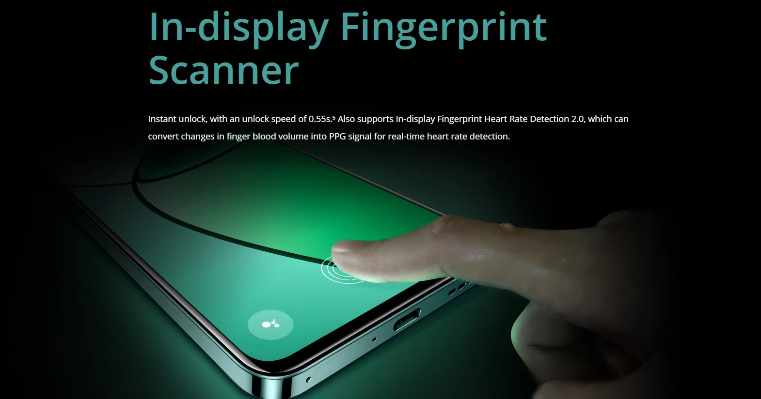 Desbloqueo instantáneo, con una velocidad de desbloqueo de 0,55 S. 5 También es compatible con la detección de Frecuencia Cardíaca de huellas dactilares en pantalla 2,0, que puede convertir los cambios en el volumen de sangre del dedo en señal PPG para la detección de frecuencia cardíaca en tiempo real.