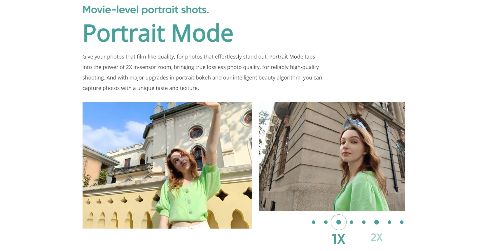 Dale a tus fotos esa calidad de película, para fotos que destaquen sin esfuerzo. El modo retrato aprovecha la potencia del zoom 2X en el sensor, brindando una verdadera calidad de foto sin pérdidas, para un disparo de alta calidad confiable. Y con las principales actualizaciones en el retrato bokeh y nuestro algoritmo de belleza inteligente, puede capturar fotos con un sabor y textura únicos.