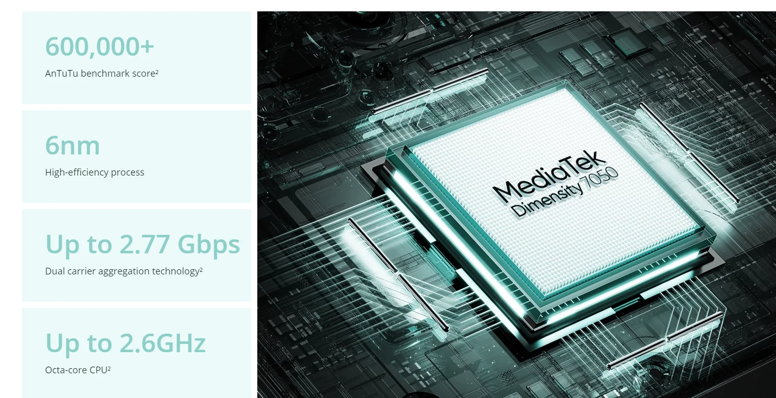 Con el chipset 6Nm 5G, obtienes un gran potencial de energía junto con un bajo consumo de energía, para una experiencia fiable, fluida y eficiente.