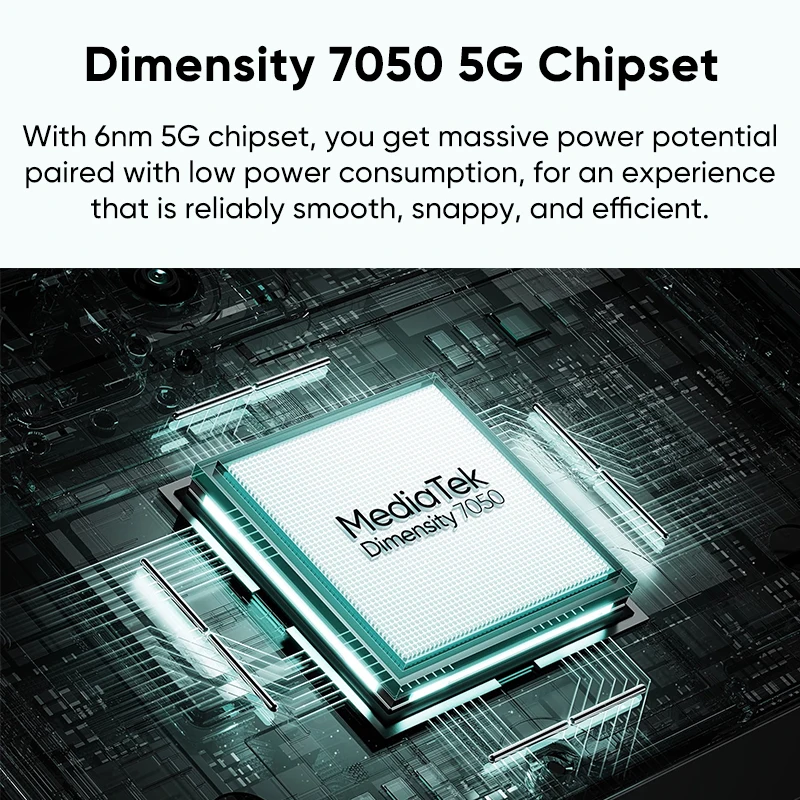 Con el chipset 6Nm 5G, obtienes un gran potencial de energía junto con un bajo consumo de energía, para una experiencia fiable, fluida y eficiente.