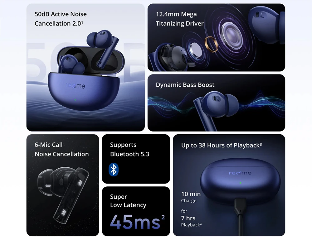 La cancelación activa de ruido más fuerte de la industria jamás vista.Con 50 dB de cancelación de ruido profundo, podrás disfrutar de tranquilidad como nunca antes.Utilizando un chipset de cancelación de ruido de doble núcleo ultrapotente, combinado con dos micrófonos con cancelación de ruido SNR alta, realme Buds Air 5 ofrece una reducción de ruido de siguiente nivel a diferencia de cualquier otra cosa en el segmento.