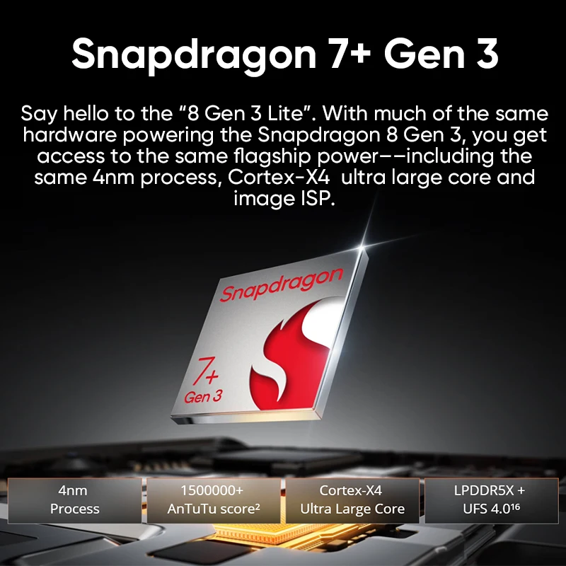 Procesador------- Procesador Snapdragon 7 + Gen 3Proceso de 4nm, hasta 2,8 GHz, Adreno™732 @ 950MHz
