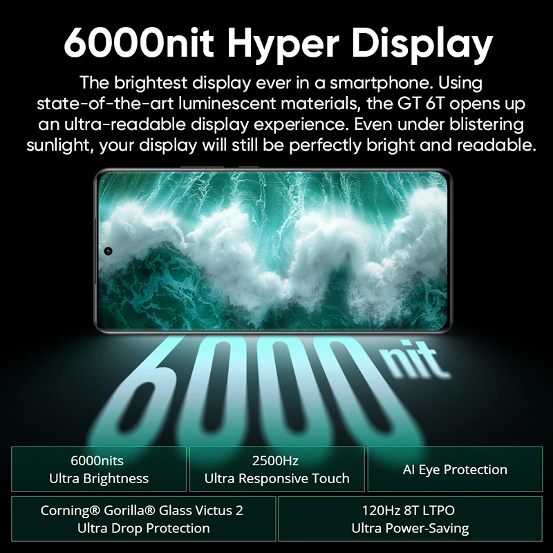 El GT 6T de la serie 2 está armado con uno de los materiales de visualización más resistentes utilizados en los teléfonos inteligentes, con un 117% de mayor protección contra caídas y un 100% de mayor resistencia a los arañazos en comparación con Gorilla Glass 5. Y con una pantalla curva 3D, obtienes lo mejor de la durabilidad y la estética insignia.