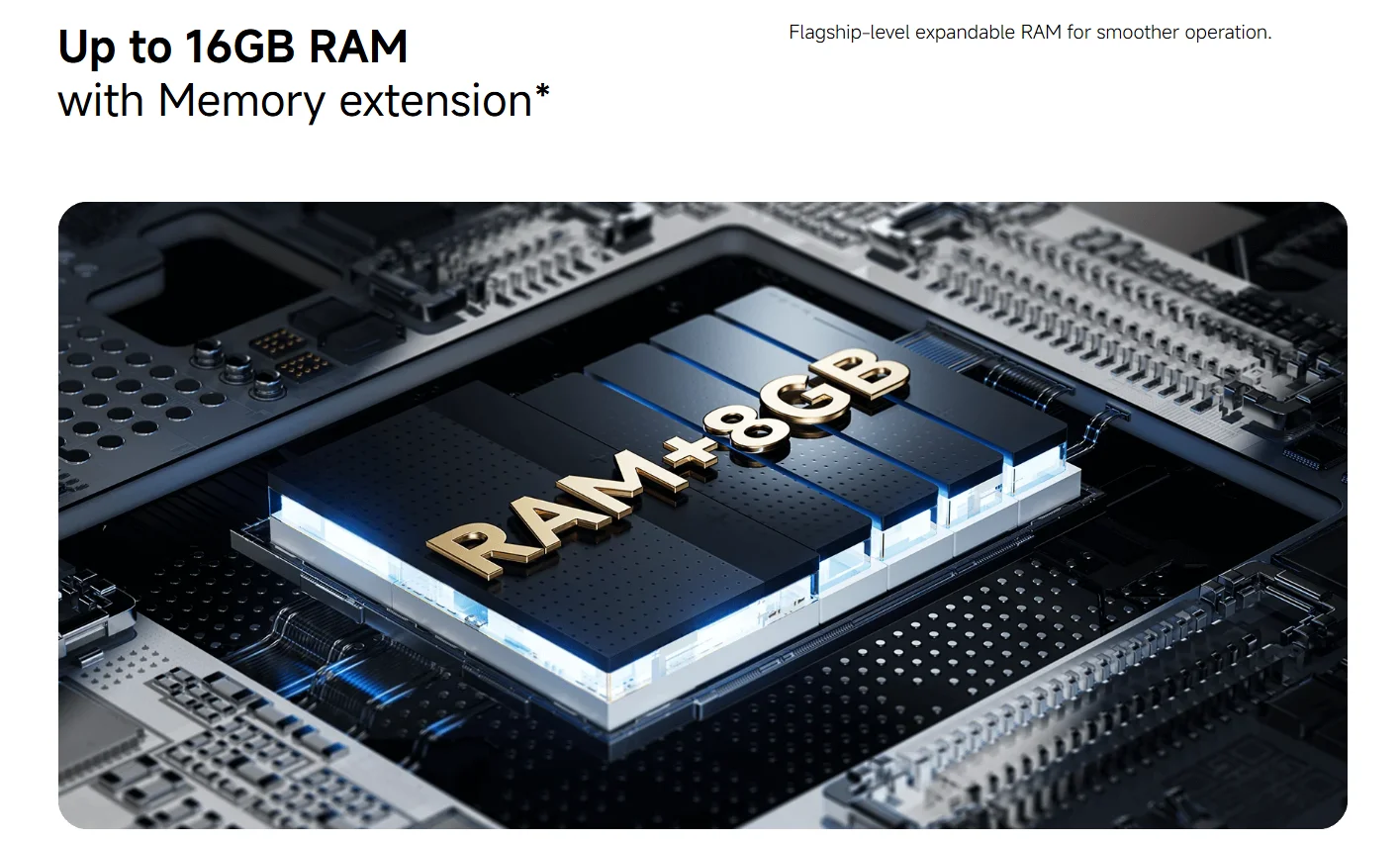 * 16 GB de RAM con extensión de memoria se basa en la versión de 8 GB de RAM.La RAM adicional ocupará una cantidad correspondiente de almacenamiento de ROM.La extensión de memoria solo está disponible cuando hay suficiente espacio de almacenamiento en su dispositivo.Ampliación real de variantes de capacidad de almacenamiento RAM entre diferentes modelos.