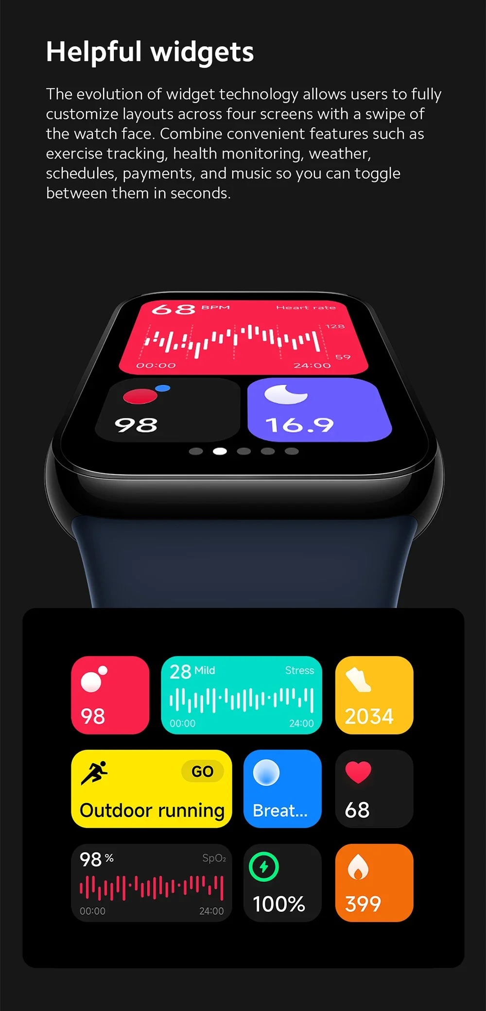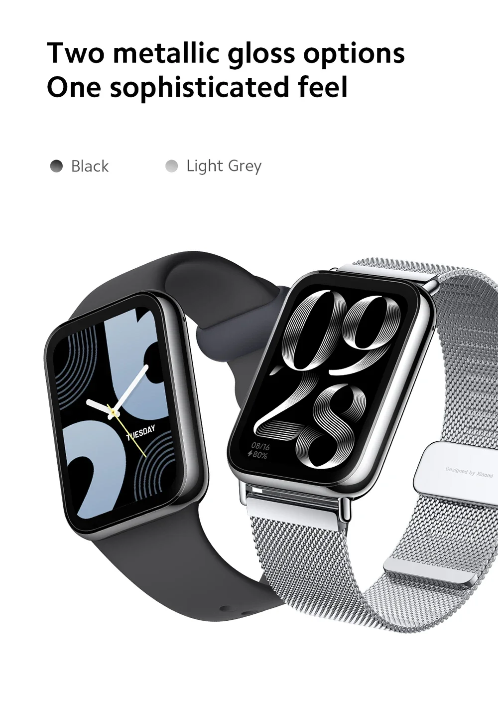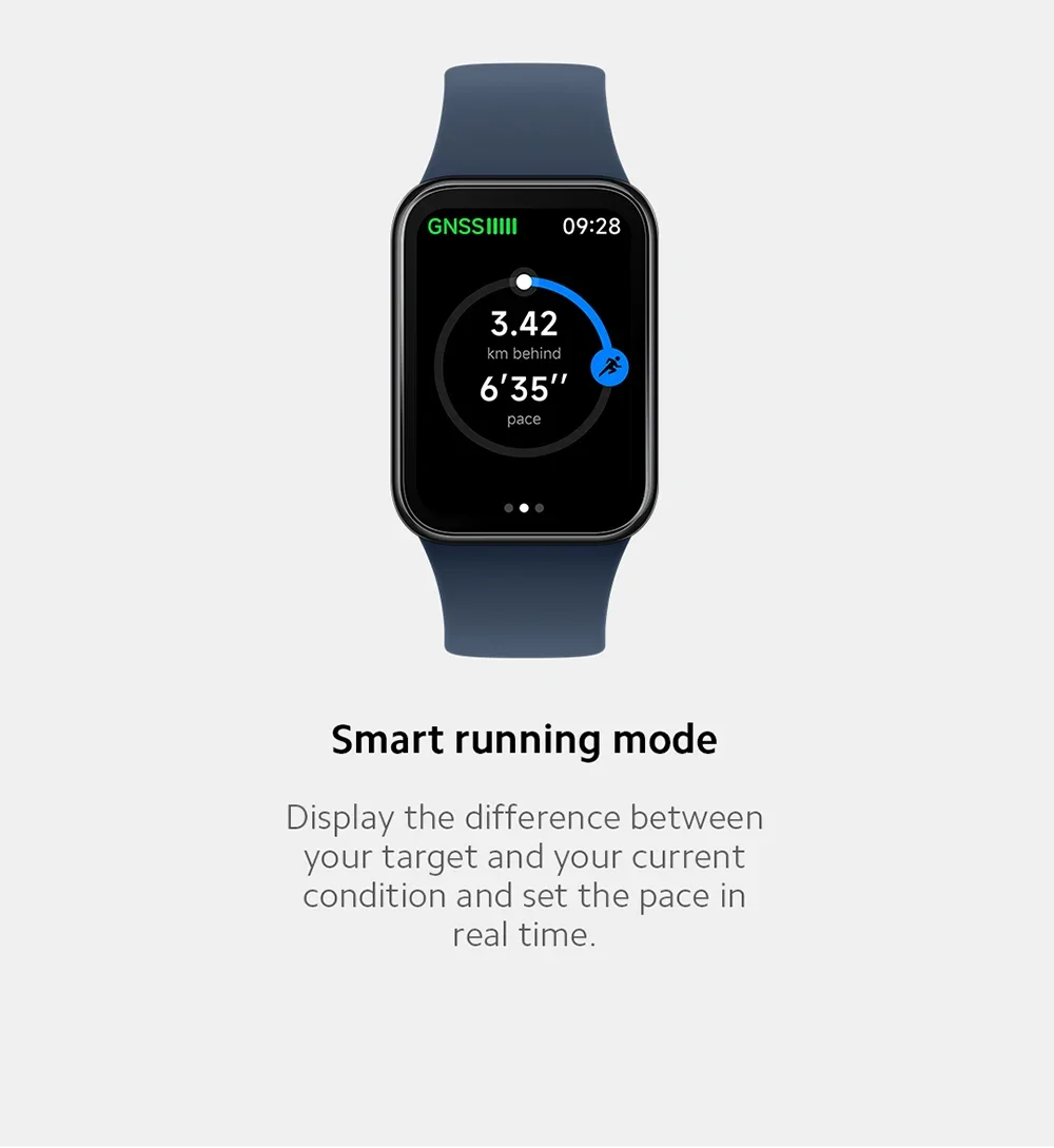 Modelo del producto: ----- M2333B1Peso neto: -------- Aprox. 22,5G (peso sin la correa)Dimensiones: ------- 46x33,35x9,99mm (excluyendo el sensor de frecuencia cardíaca)Tamaño y tipo de pantalla: -------- Pantalla cuadrada a color AMOLED de 1,74"Resolución de pantalla: --------- 336x480, 336PPI con pantalla táctil completaBrillo de la pantalla: --------- Máximo 600 NITs, con ajuste automático de brilloMaterial de la cubierta: ------- vidrio reforzado GG3Material de la carcasa: ------- polímero de fibra de alta resistencia + NCVMSensores: ------ acelerómetro/giroscopio/frecuencia cardíaca óptica y oxímetro de pulso/sensor de luz ambientalAplicaciones compatibles: ------ aplicación Mi Fitness