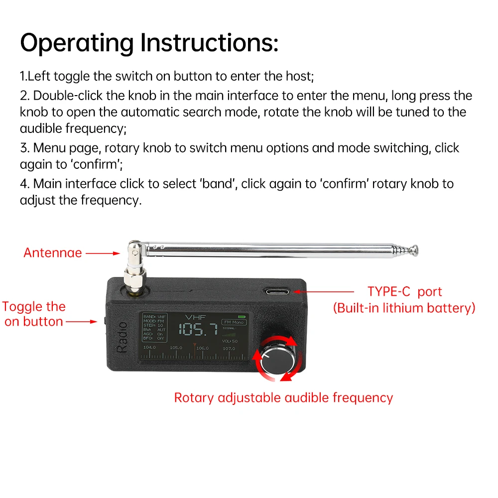 4, diseño de antena de alto rendimiento: equipada con una antena de alto rendimiento, que cubre una amplia gama de frecuencias (9,9 KHz a 108 MHz), mejorando efectivamente la recepción de la señal y garantizando resultados de escucha claros y estables