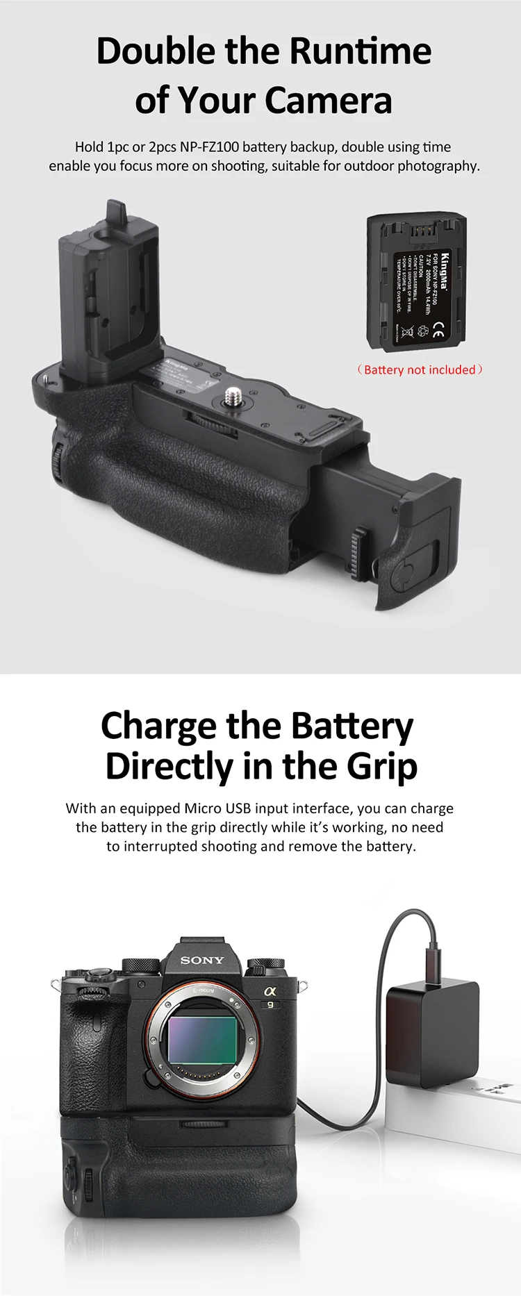 Esta empuñadura para cámara puede contener hasta dos baterías NP-FZ100 de alta capacidad para suministrar energía adicional al a7R IV, duplicando efectivamente su tiempo de operación y permitiéndole disparar durante períodos prolongados sin interrupciones.Las baterías se pueden cargar mientras aún están dentro del agarre de la cámara usando el puerto USB del cuerpo de la cámara.La empuñadura de la cámara VG-C4EM tiene una construcción de aleación de magnesio resistente al polvo y la humedad que es similar a la construcción del Alpha.Utilice el Sony Alpha cómodamente con el mango vertical VG-C4EM.