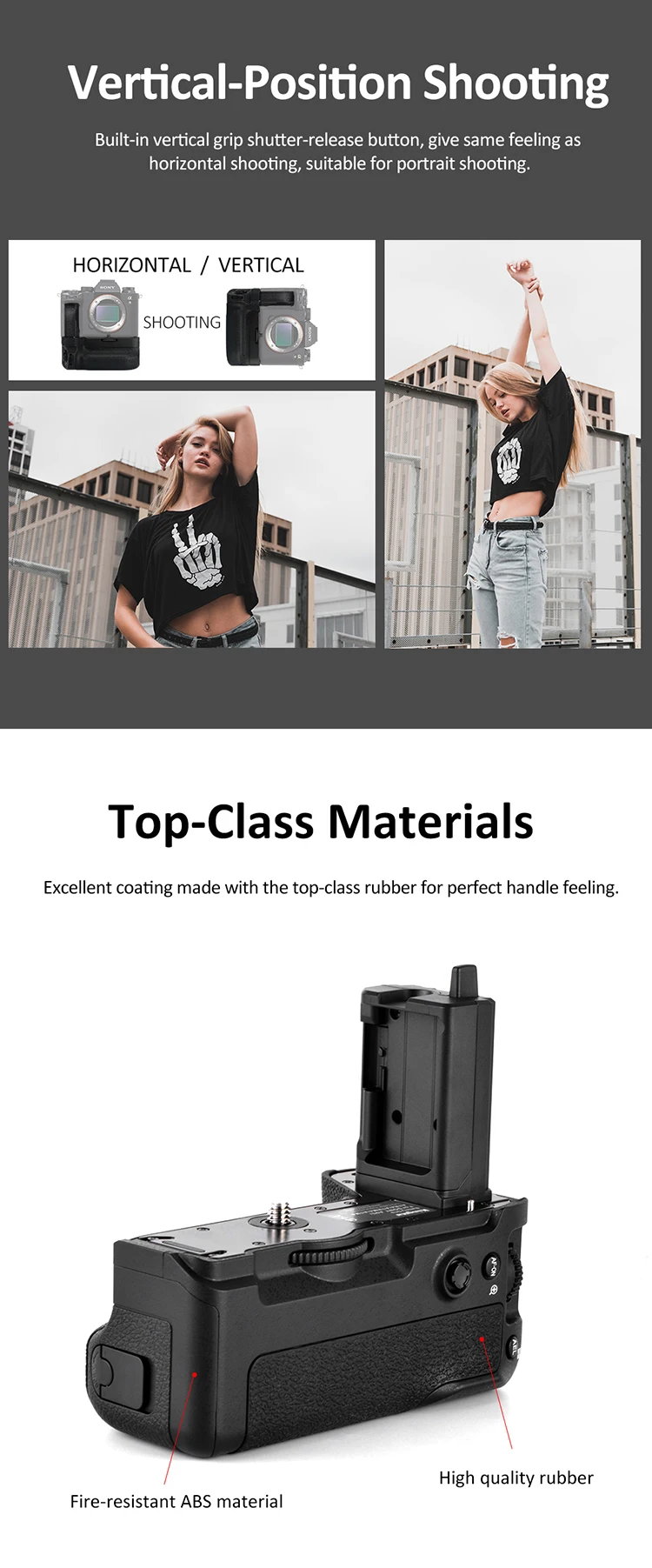 Su diseño es similar al diseño general del cuerpo de la cámara, dándole la misma sensación que al sostener la cámara horizontalmente.Otras características útiles incluyen un botón de obturador secundario y un selector múltiple.