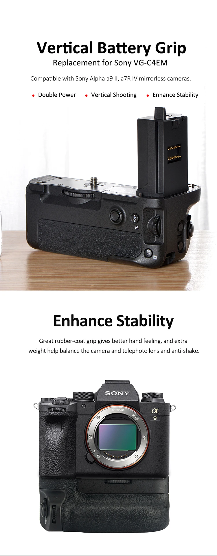 El Sony VG-C4EM es un agarre de cámara dedicado para el nuevo Alpha y presenta un diseño ergonómico para brindarle un agarre cómodo al sostener su cámara en posición vertical.El agarre también mejora la movilidad al disparar con la mano.