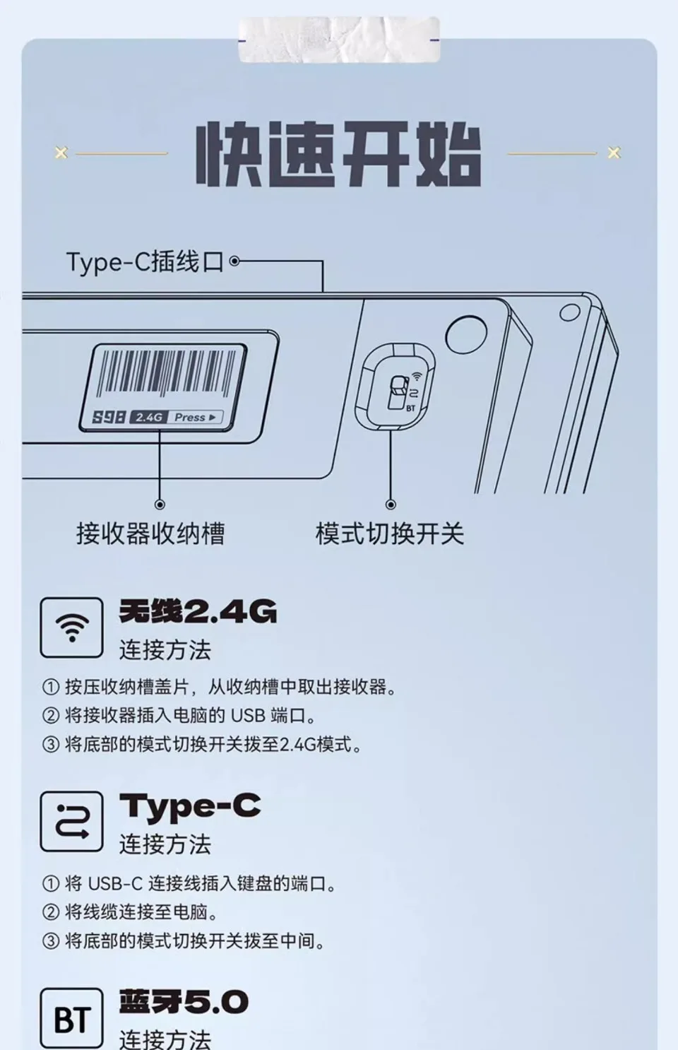 Sistemas de soporte:Modo cableado: Windows 7/8/10 o macOS10.14.6 o superior.Modo receptor USB: Windows 7/8/10 o macOS10.14.6 o superior.Modo Bluetooth: Windows 10 1809 Construye 17763 o macOS 10.14,6 o superior.