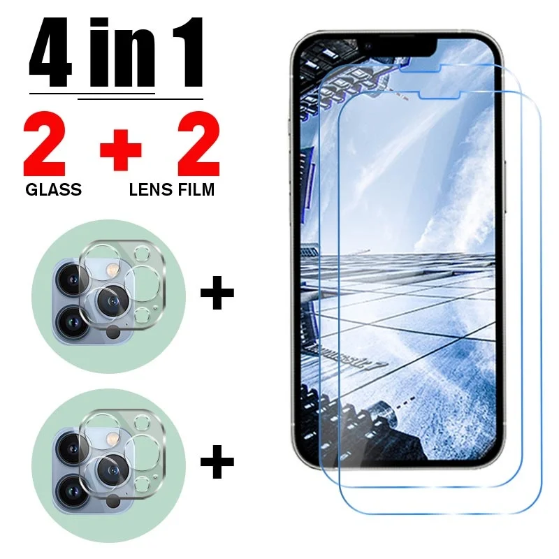 Vidrio protector 4 en 1 para iPhone 11 Pro X XR XS Max Protector de pantalla de cámara en iPhone 7 8 6 6s Plus 13 Pro Max Glass