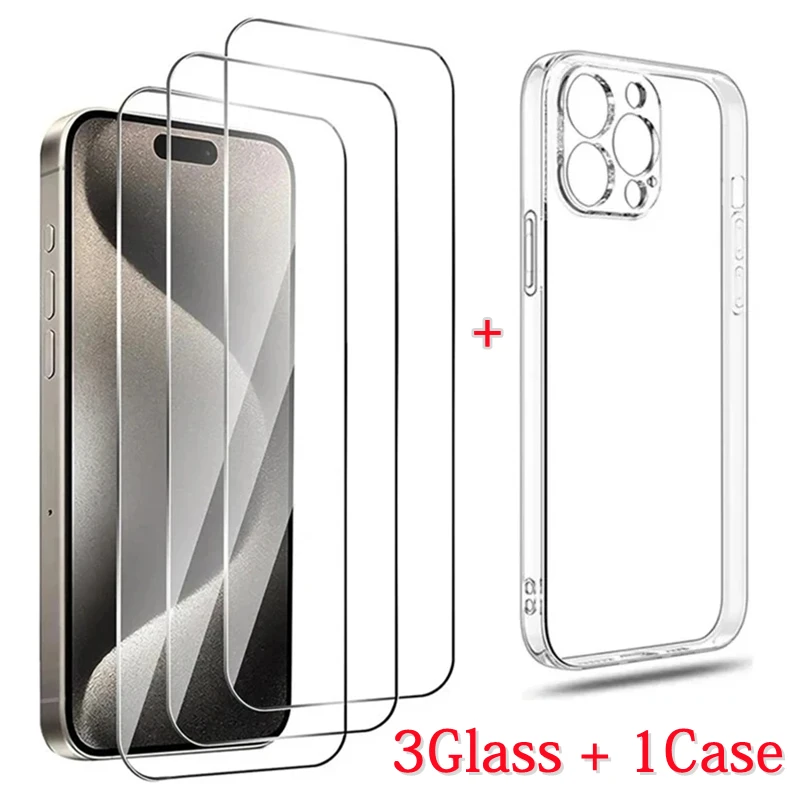 Vidrio templado 3 en 1 para iPhone 15 11 12 13 14 Pro Max Mini 8 Plus funda de teléfono transparente para iPhone XS MAX X XR SE protectores de pantalla