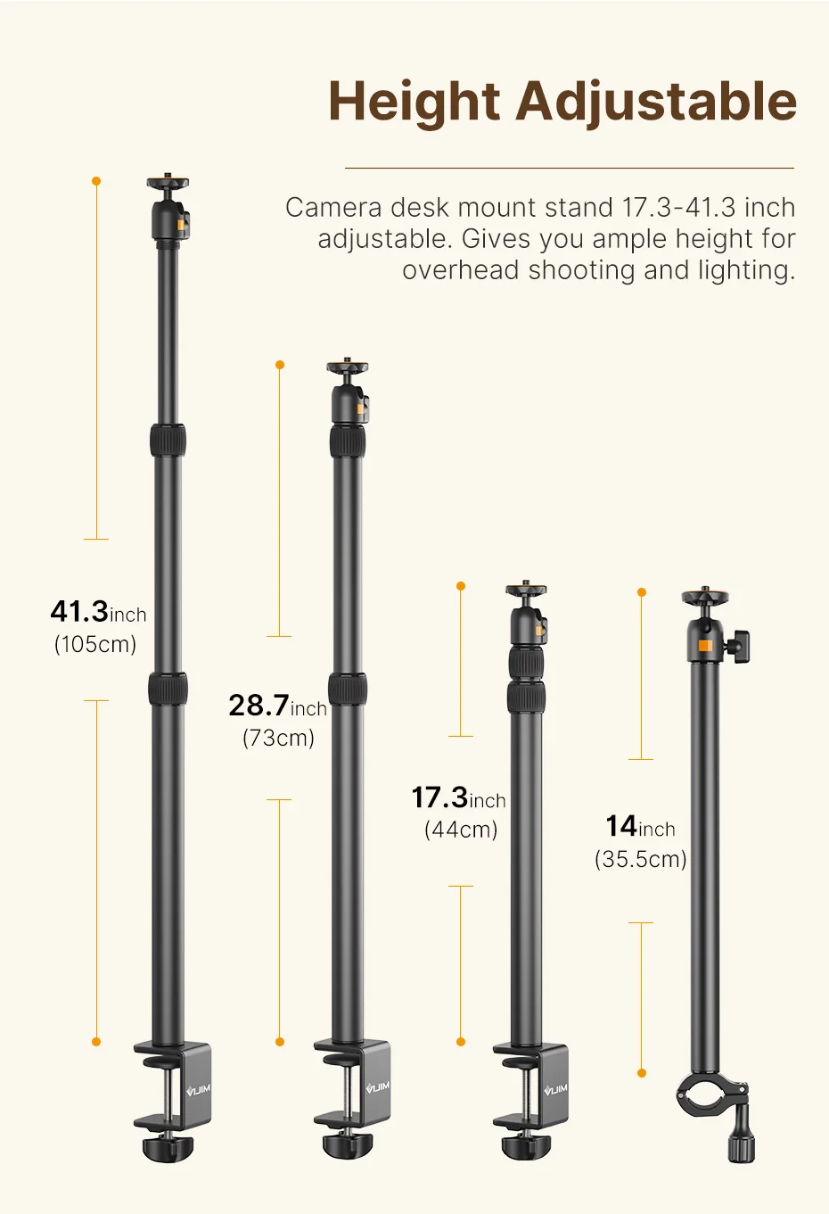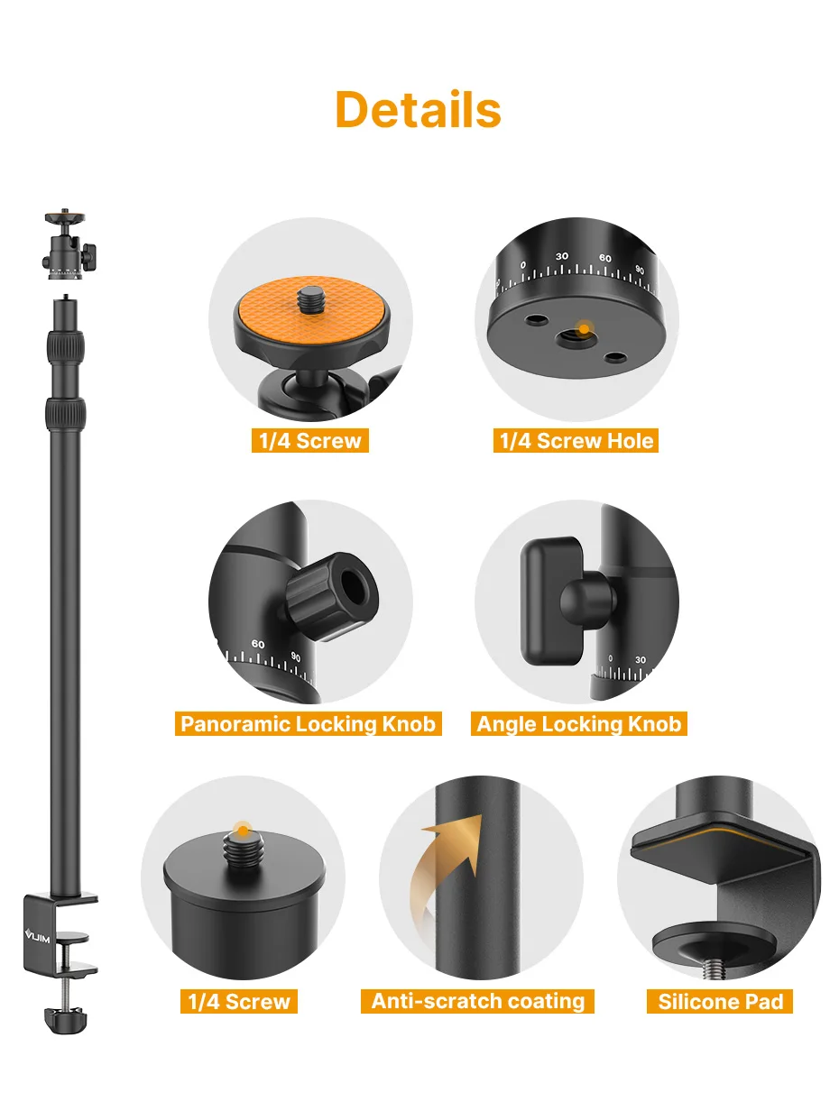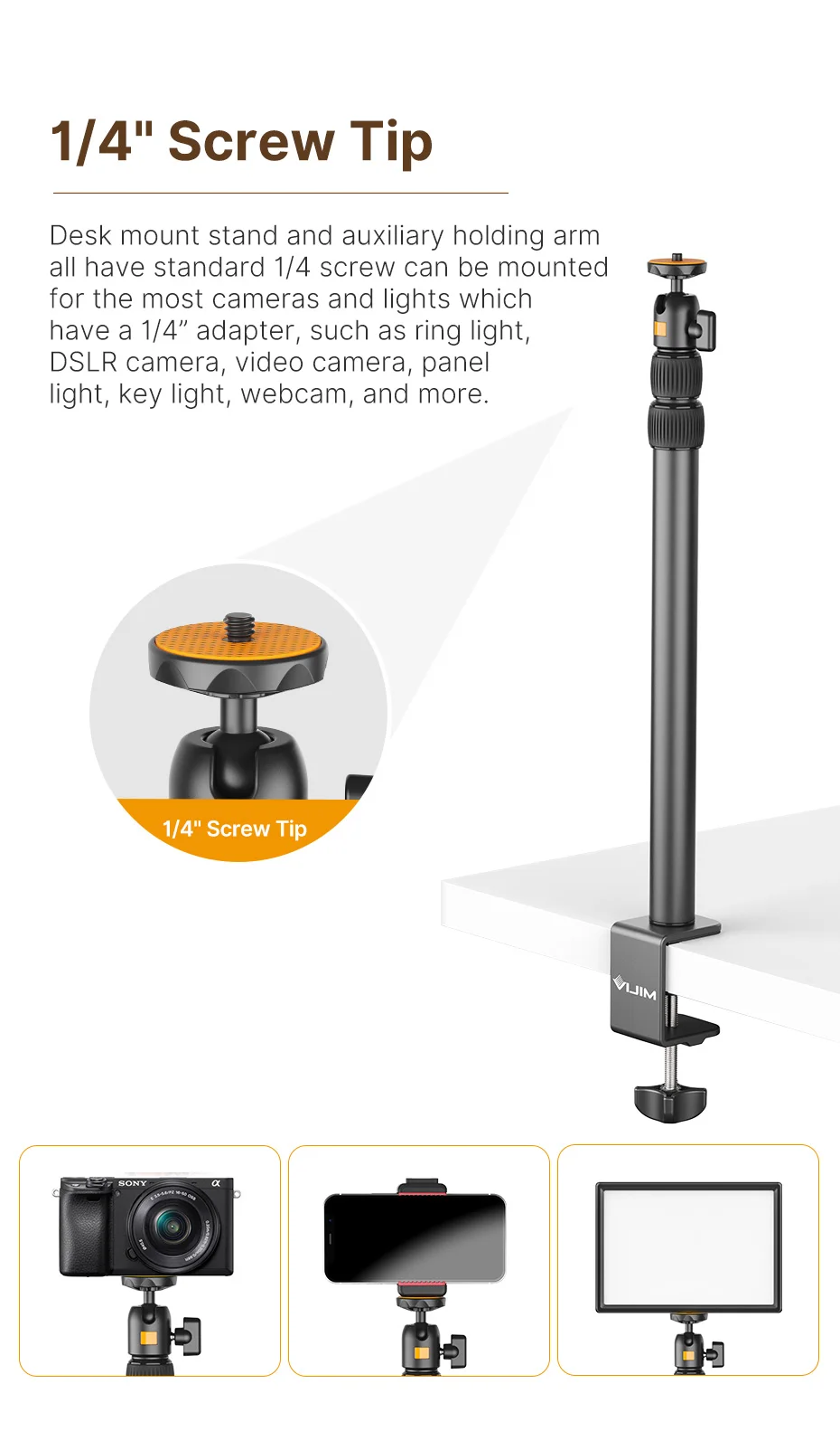 El soporte es muy resistente y bien construido. Puse mi Sony a6500 en él y fue súper estable. Sin embargo, es importante notar que la abrazadera que se conecta a la mesa no tiene una abertura de 5 cm, como se indica en el anuncio. En realidad, mide aproximadamente 4.5 cm, lo que me obligó a hacer una muesca en el madera con una sierra de romper.