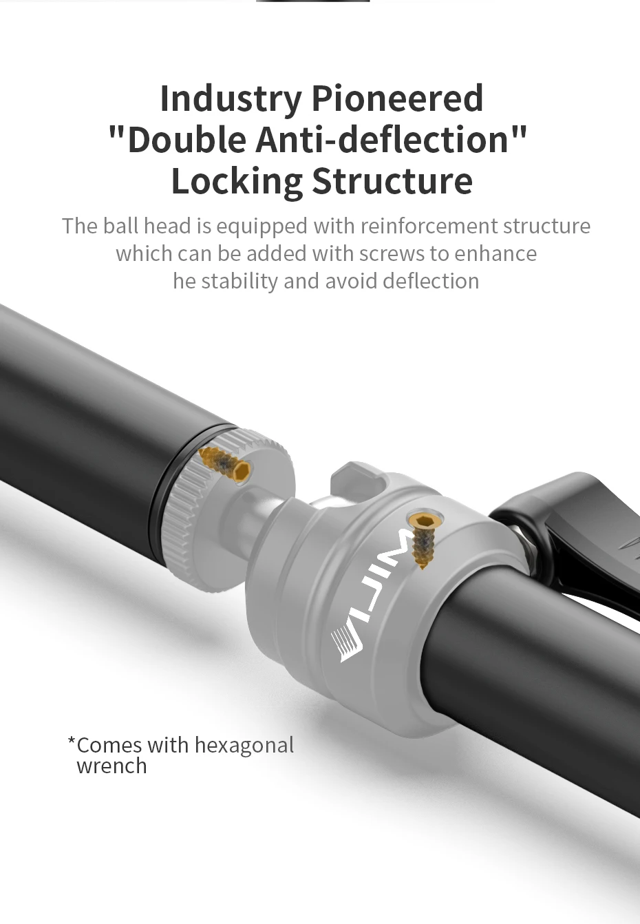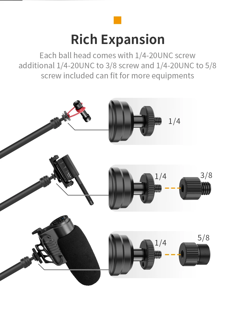 Cada cabeza de bola viene con tornillo 1/4-20UNC, 1/4-20UNC adicional a 3/8 tornillo y 1/4-20UNC a 5/8 tornillo incluidos, puede caber para más equipos