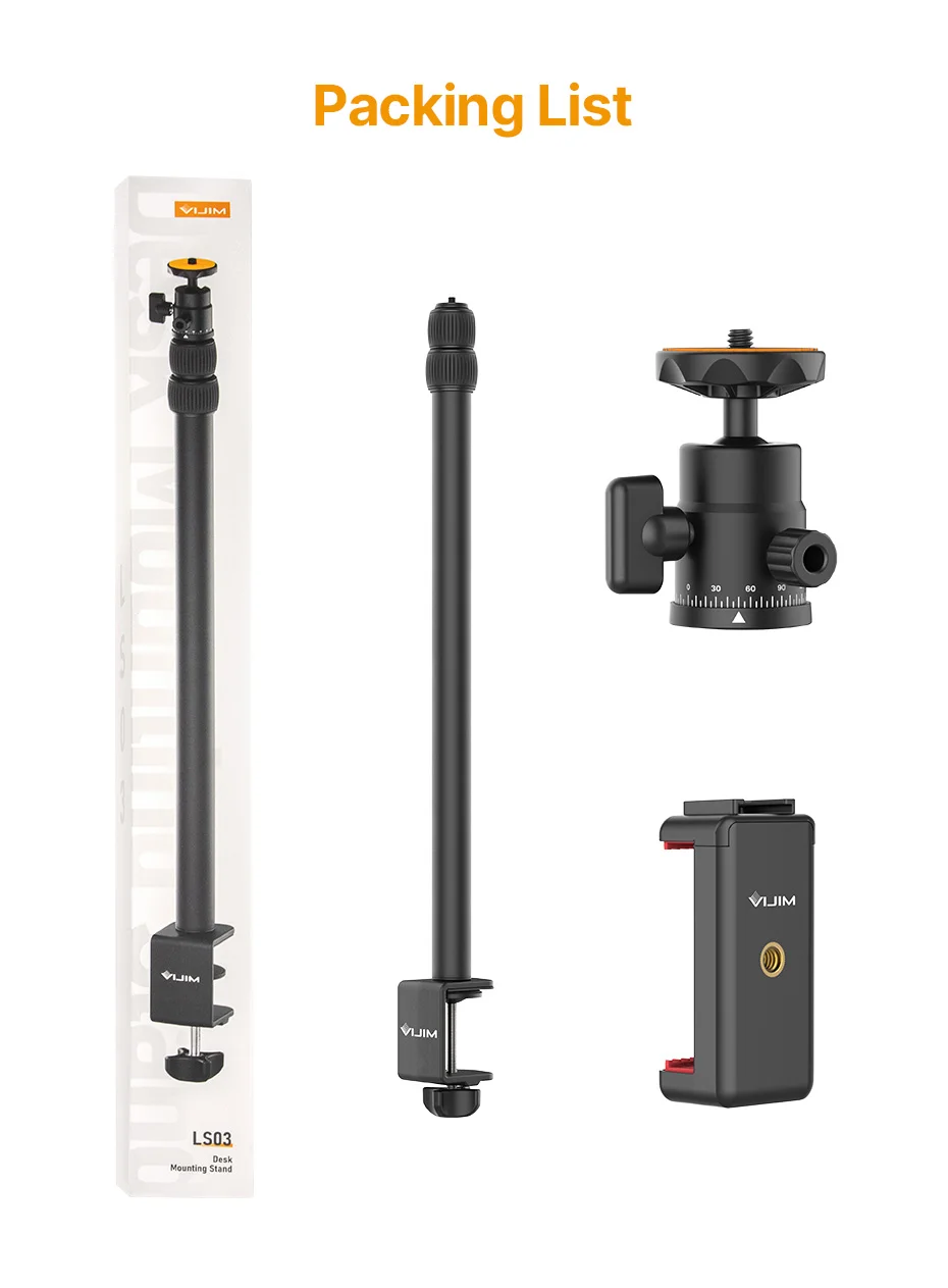 Vijimy Trípode Soporte Luz LS03 Extensible Clip Teléfono Cabeza Bola Giratoria Tornillo 1/4 Pulgadas
