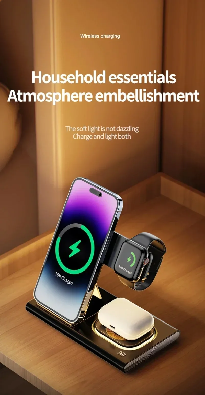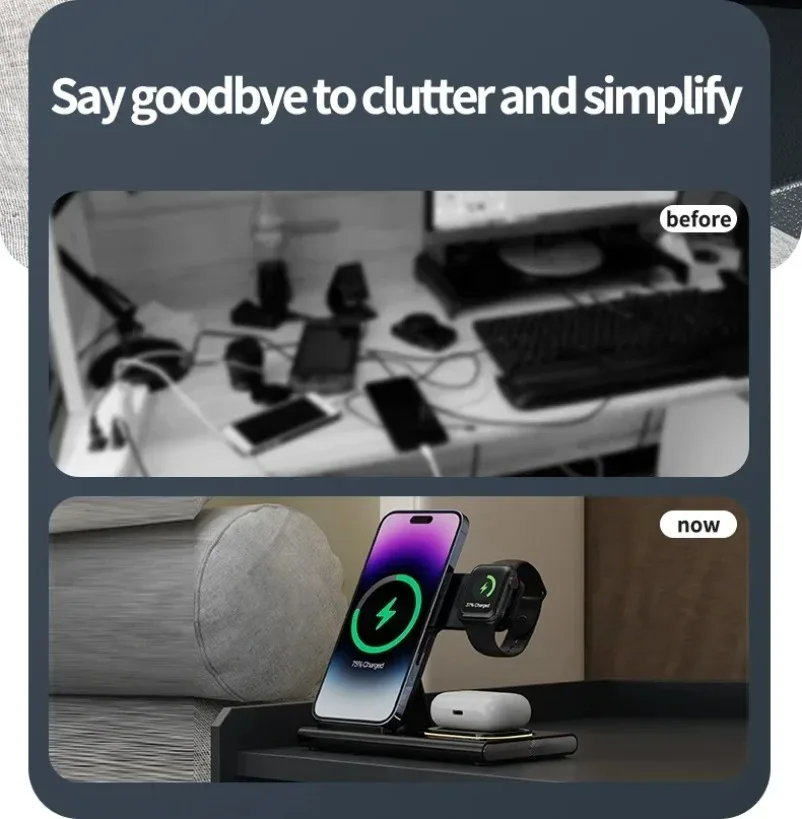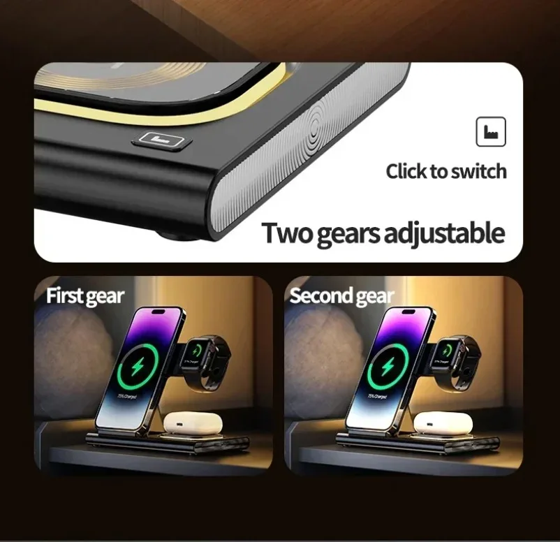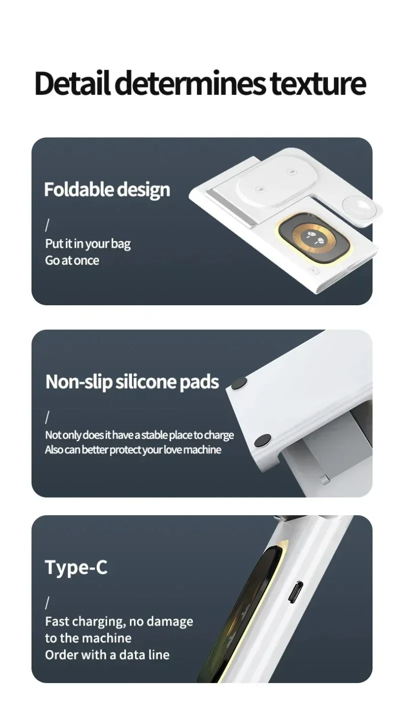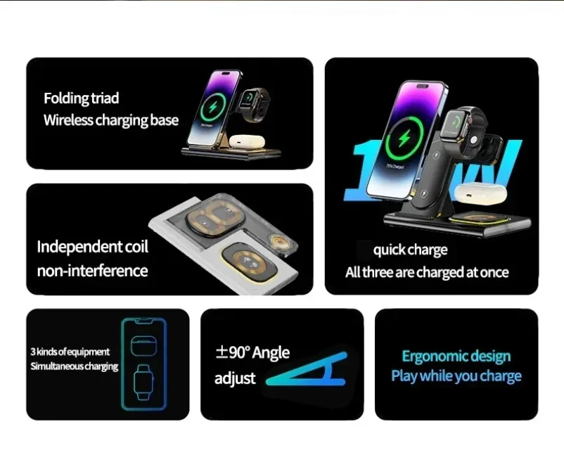 [Cargador inalámbrico rápido]Simplemente coloque sus dispositivos inalámbricos en la estación de carga y comenzará al contacto una carga constante y eficiente.Después de muchas pruebas extremas y retroalimentación de ventiladores, utilizamos chips de carga de alta potencia y electrónica de clase mundial para garantizar la calidad de carga rápida de la estación de carga.El cargador inalámbrico tarda entre 2 y 3 horas en cargar completamente su teléfono, reloj y auricular con un adaptador de 18 W equipado.