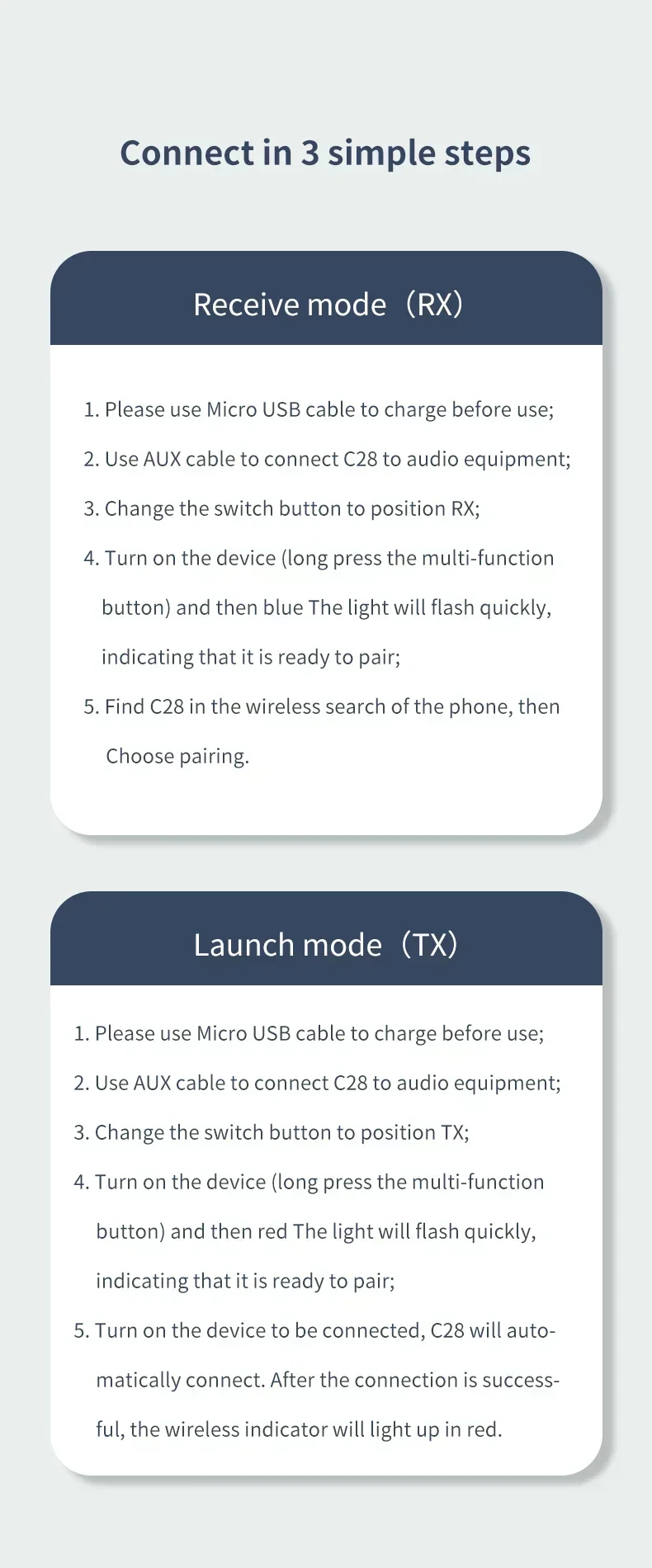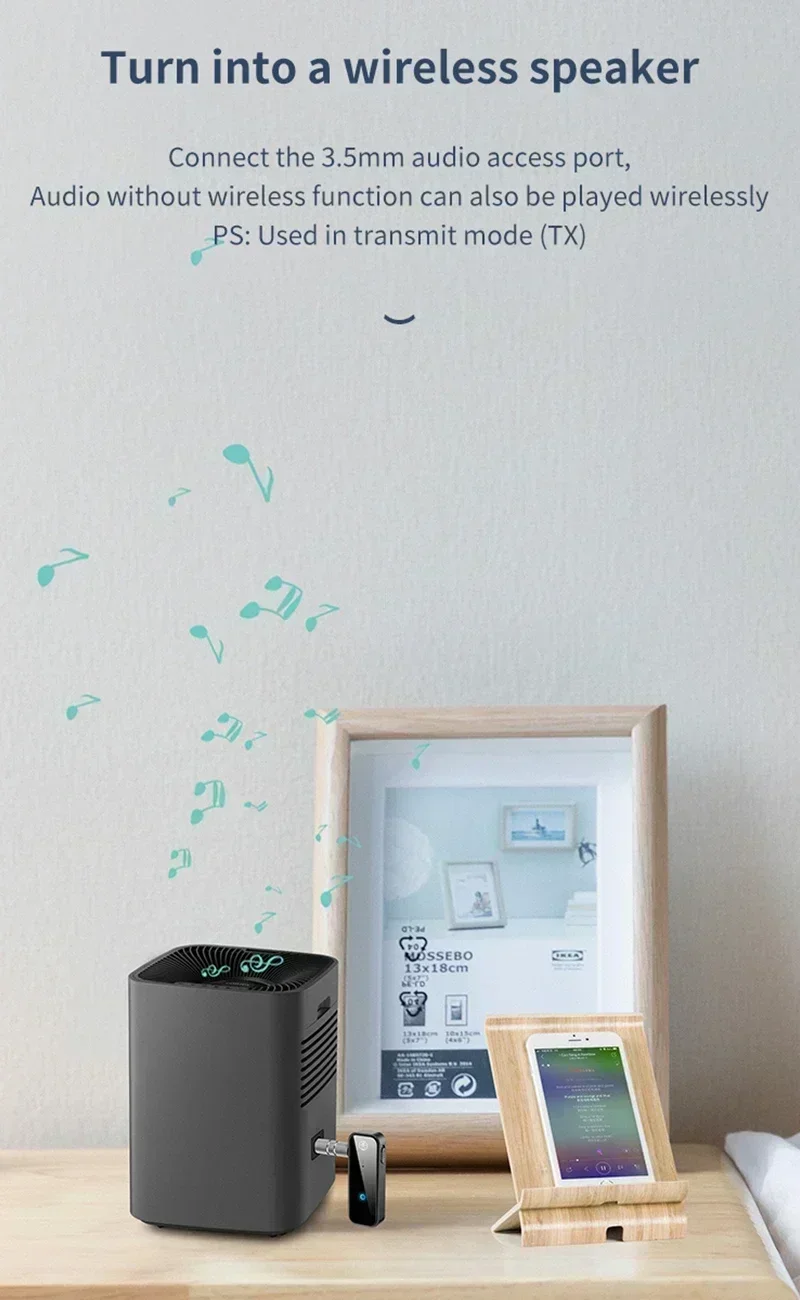 2.MODO RECEPTOR TRANSMISOR: Diseño 2 en 1, al usar este adaptador inalámbrico, puede enviar y recibir todo el audio de forma libre y sencilla.El transmisor permite que su televisor, receptor AV, radio y otros dispositivos fuente de audio domésticos transmitan música a sus auriculares o parlantes Bluetooth;El receptor permite que dispositivos que no sean Bluetooth, como el estéreo de su hogar o el receptor AV, transmita música de forma inalámbrica desde su teléfono celular/PC.