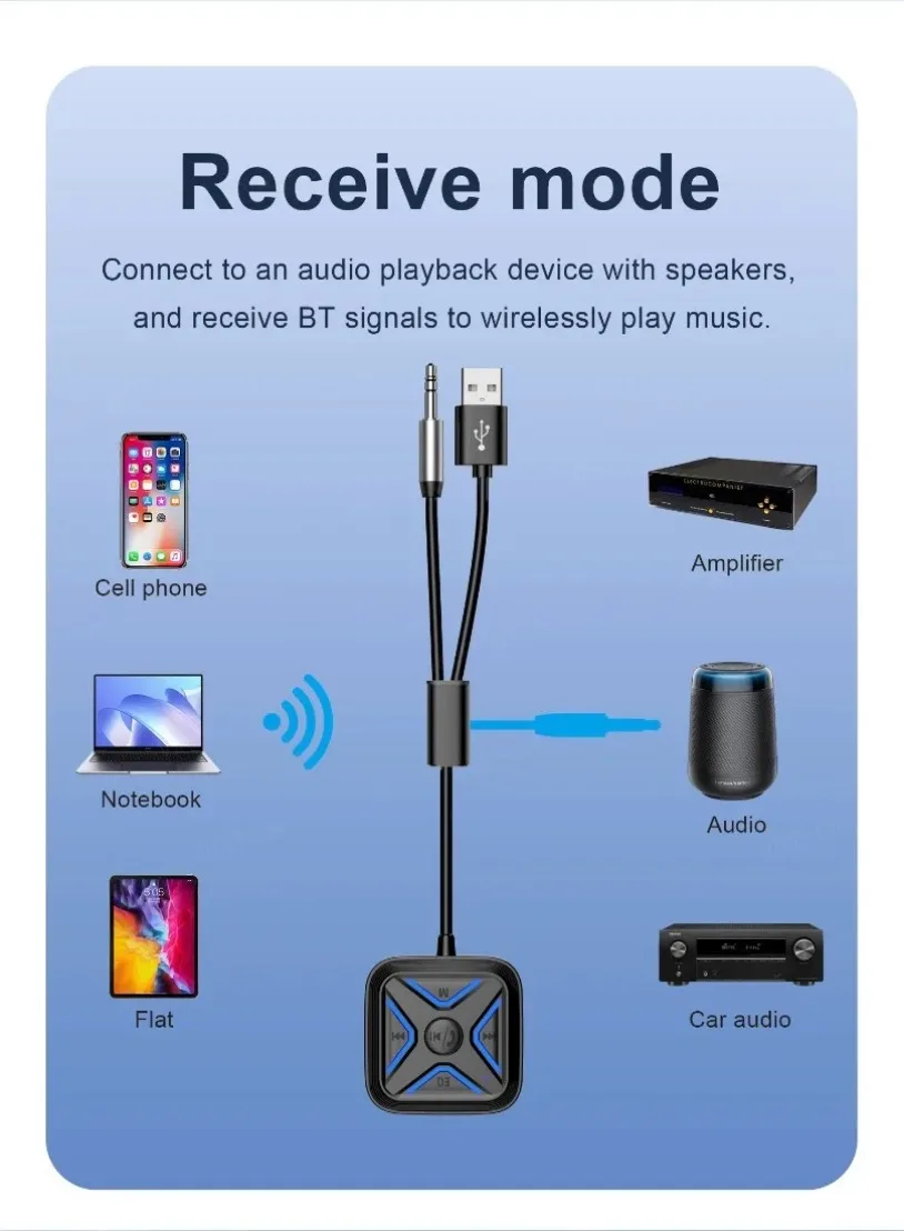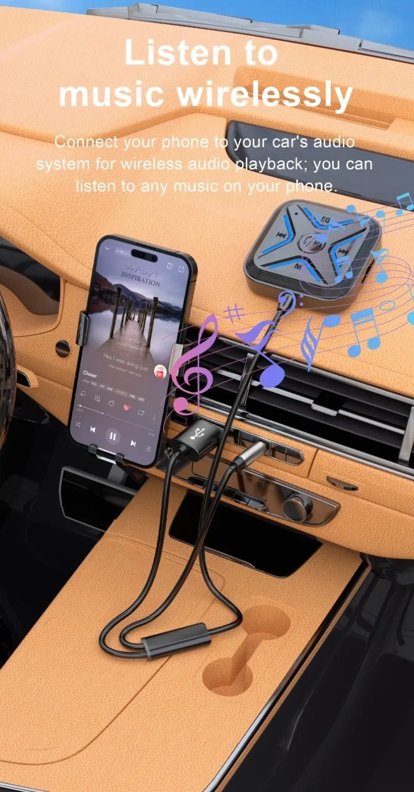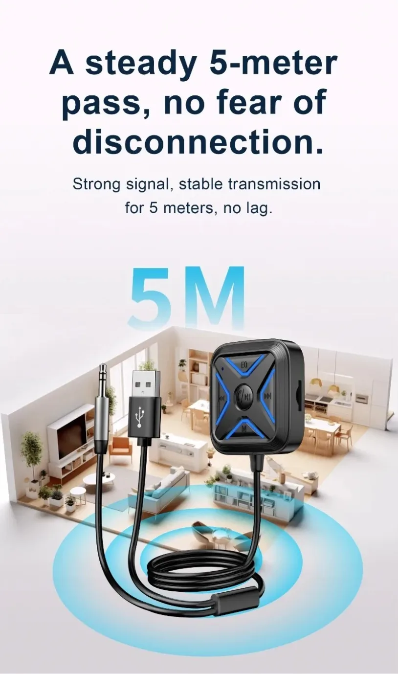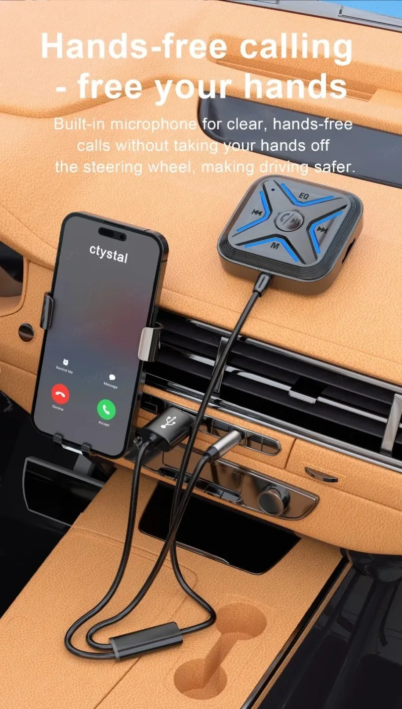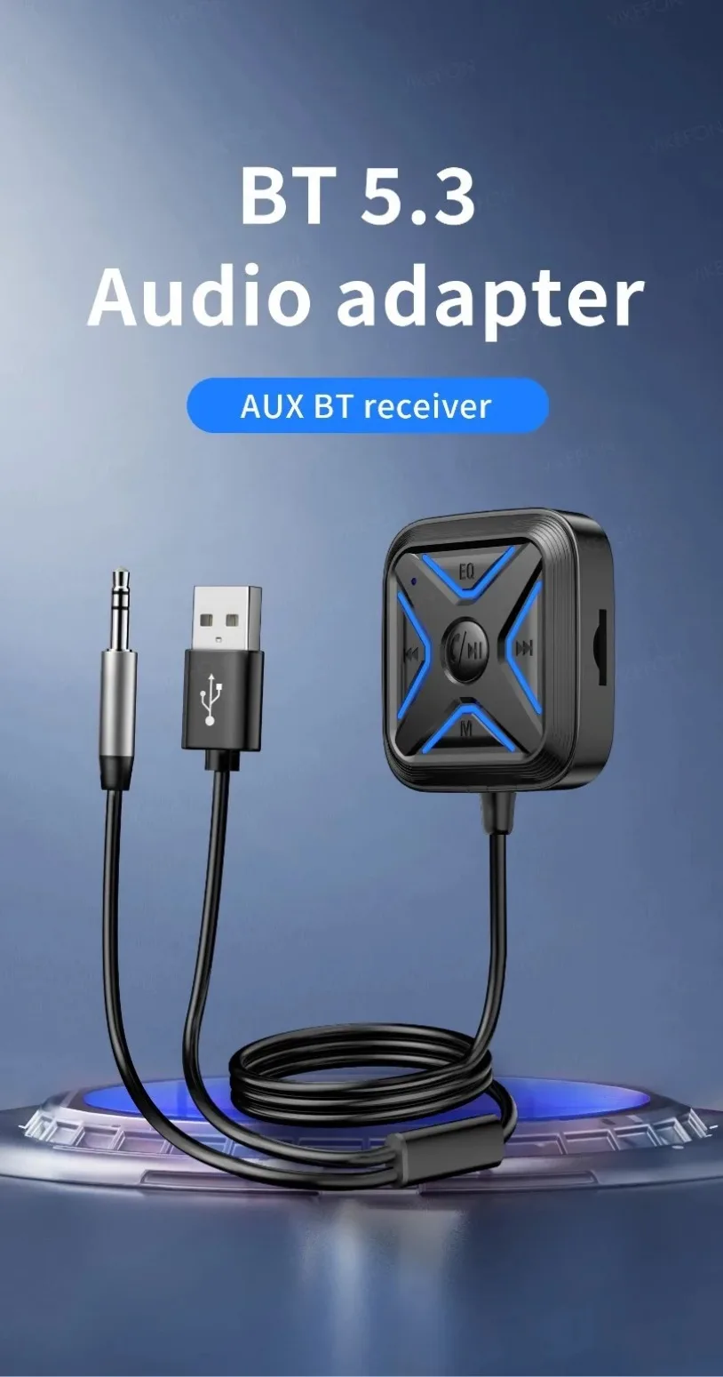 VIKEFON Bluetooth 5,3 AUX adaptador de coche micrófonos duales receptor Bluetooth para llamadas manos libres de coche música automática Audio estéreo