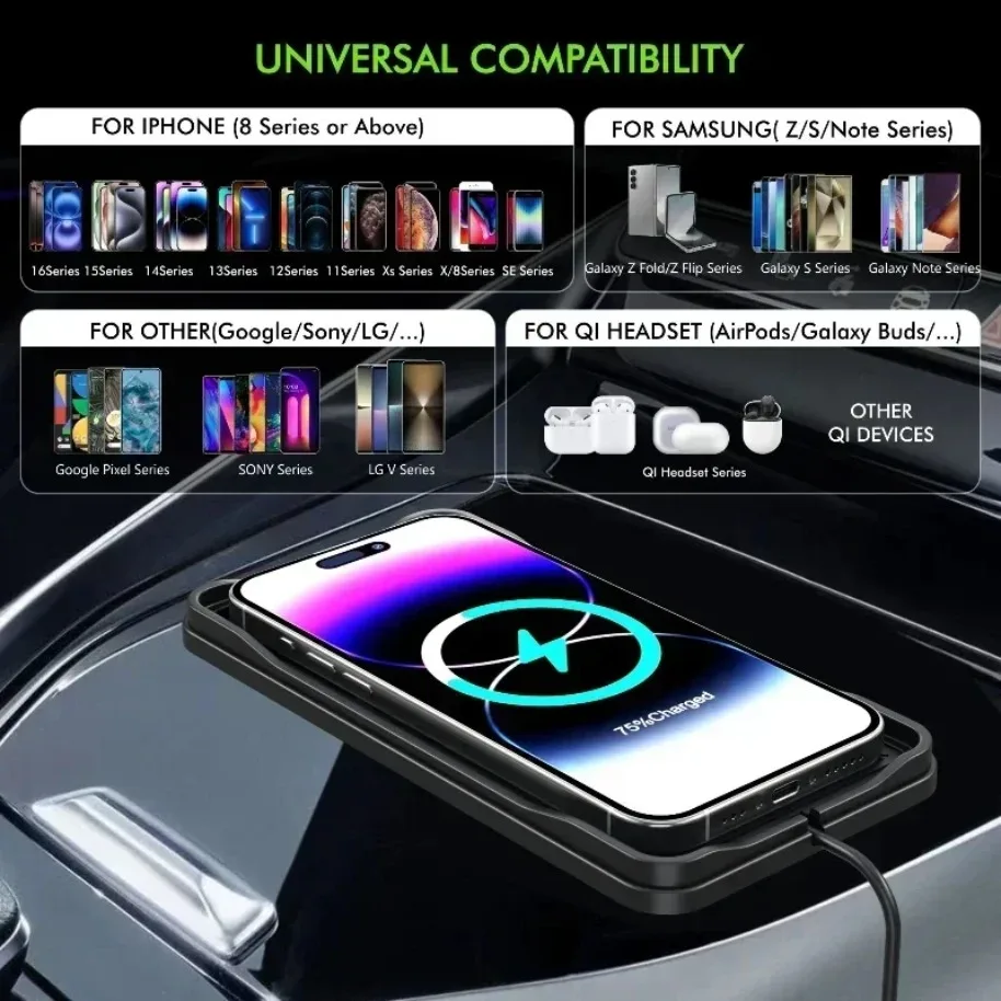Característica: [Compatibilidad ampliada]: Con soporte de salida de 15W/10W/7,5W/5W, nuestro cargador inalámbrico será compatible con todos los teléfonos móviles que admitan carga inalámbrica.Entonces, si su teléfono admite carga inalámbrica, ¡cómprelo! [Diseño liviano]: Diseño ligero, goma antideslizante elegante y compacta.Este cargador inalámbrico mide solo 8 mm/0,31 pulgadas de delgado y ocupa muy poco espacio, lo que facilita el embalaje en una bolsa de importación.El cargador inalámbrico de alta velocidad se puede transportar fácilmente en viajes o negocios.Este cargador es resistente y elegante, sin importar lo que se use en el automóvil, en la oficina o en casa. [Tecnología de carga rápida]: Admite múltiples protocolos de carga rápida, incluido el estándar Qi, para proporcionar una carga rápida inalámbrica de hasta 15 W para su teléfono inteligente, asegurando que el teléfono pueda recuperar energía rápidamente en poco tiempo. [Diseño estable]:El cargador inalámbrico tiene un diseño elevado alrededor, para que el teléfono no se deslice libremente durante la conducción, asegurando que esté siempre en estado de carga.El punto de carga de los auriculares delanteros es más bajo que el punto de carga del teléfono, lo que puede estabilizar mejor el estado de carga de los auriculares y proteger la cámara del teléfono contra rasguños.