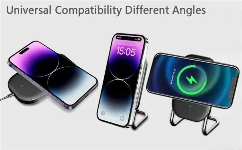 【Sin esfuerzo 180° Plegado】Puede transformar este cargador inalámbrico portátil en un soporte para teléfono en segundos.Este cargador versátil es perfecto para uso doméstico y de oficina.Ya sea que esté de viaje o de viaje de negocios, llévese este cargador 3 en 1 para alimentar varios dispositivos simultáneamente.