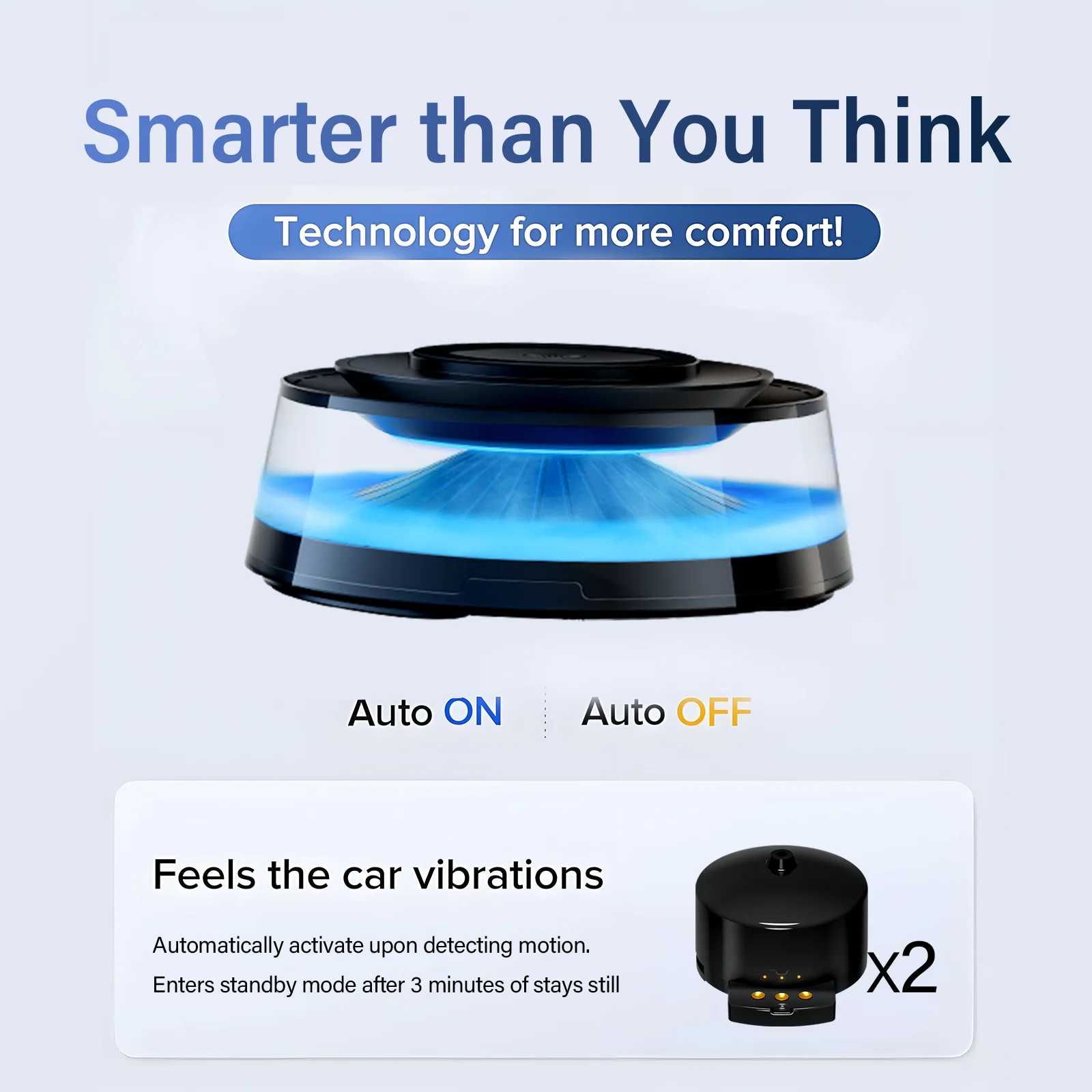 Long press the start button for 3 seconds to start the machine, and the blue light flashes twice, prompting to start the on-board working mode. Sensing that the car will automatically start spray when driving, spray will be started once every 3 minutes, and it will automatically sleep after parking.