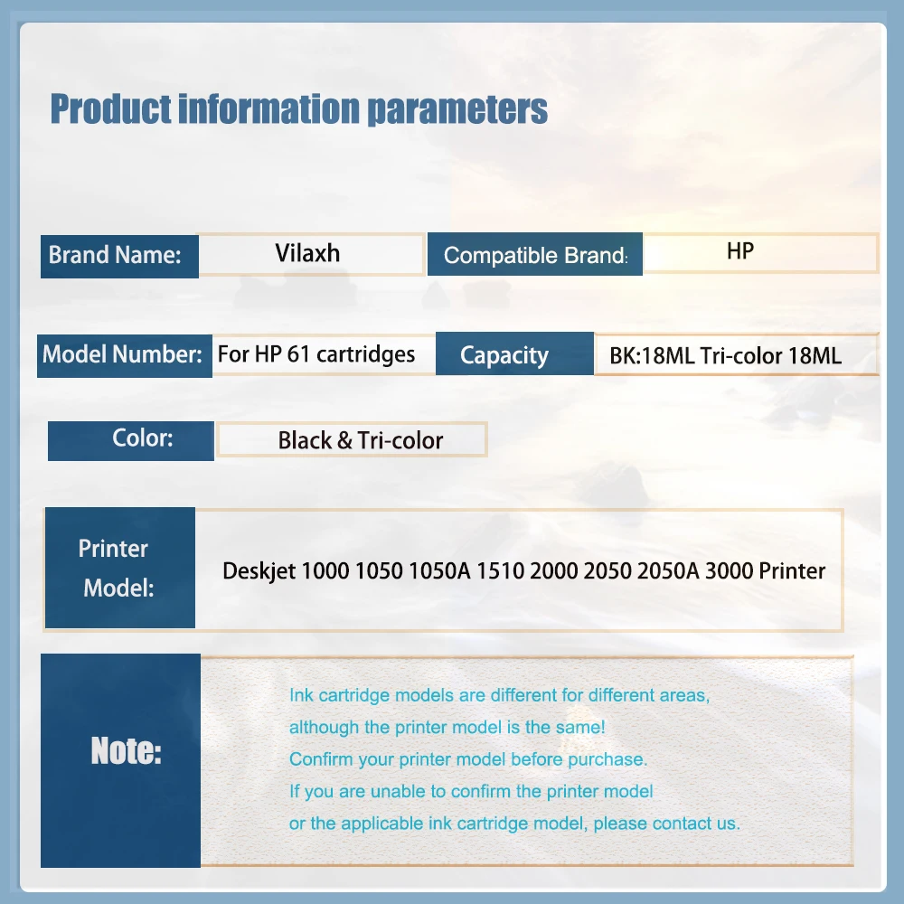 Reemplazo de cartucho de tinta recargable Vilaxh 61 XL para impresora HP 61XL HP61 Deskjet 1000 1050 1050A 1510 2000 2050 2050A 3000