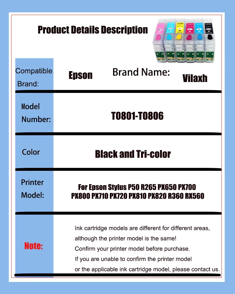 Comprar Vilaxh T0801-T0806 cartucho de tinta recargable para Epson Stylus P50 R265 PX650 PX700 PX800 PX710 PX720 PX810 PX820 R360 RX560