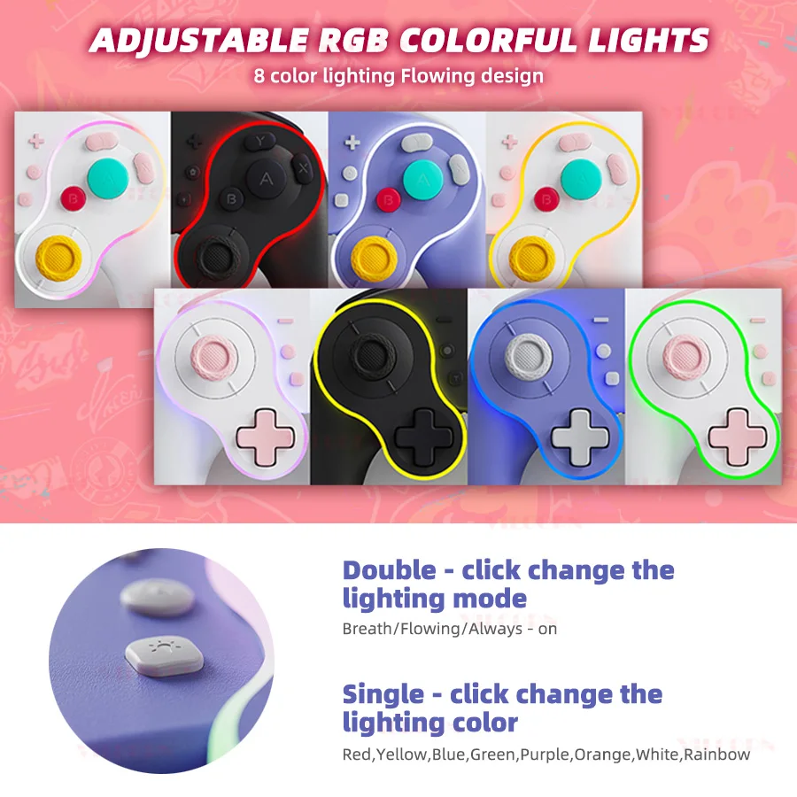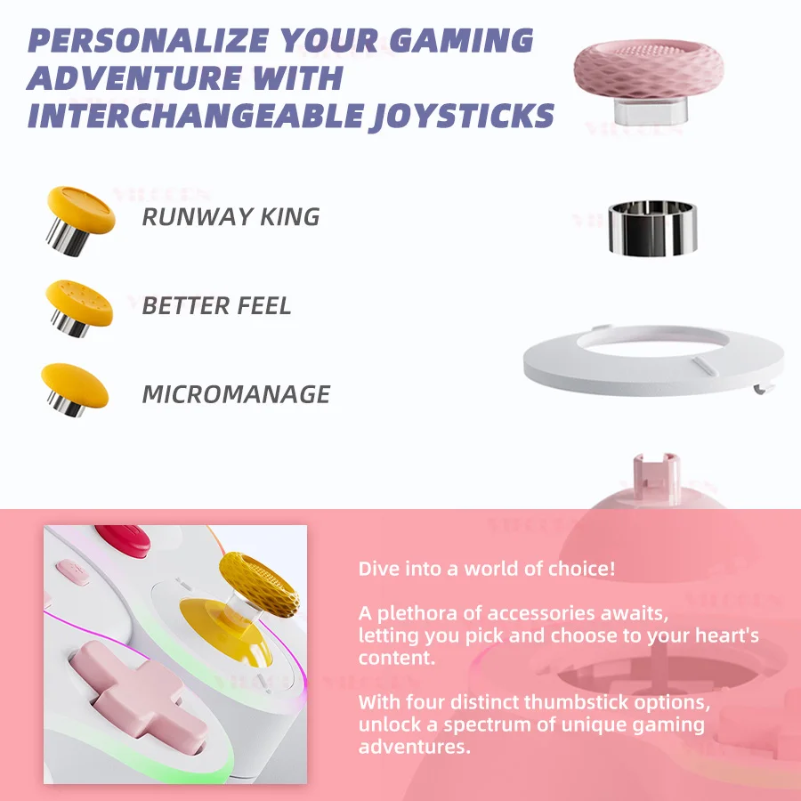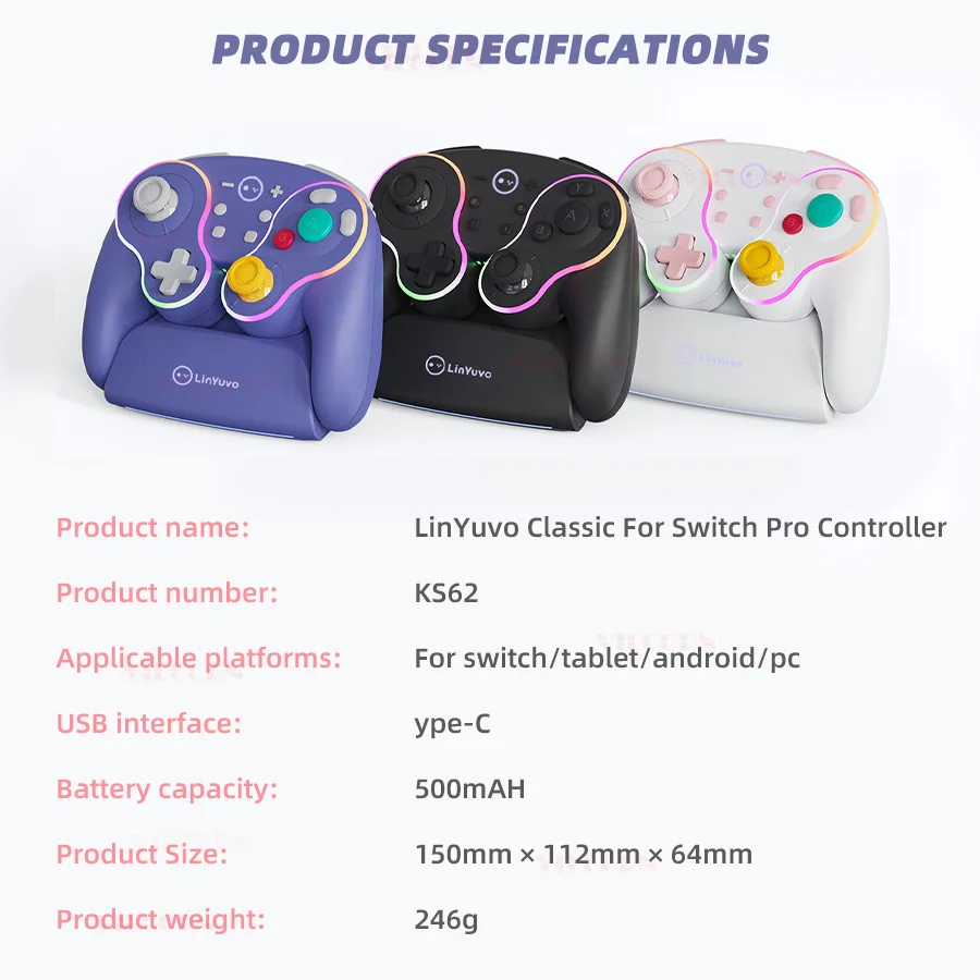 El controlador LinYuvo Classic Pro para Switch, Tablet, Android y PC es un controlador de juegos versátil y personalizable diseñado para mejorar su experiencia de juego.Al ofrecer cuatro joysticks intercambiables y anillos de joystick personalizables, puede personalizar la sensación y el rendimiento para que coincida con su estilo único.El controlador cuenta con una iluminación RGB vibrante y ajustable con 8 colores y múltiples modos de iluminación, lo que agrega un aspecto visual divertido a su juego.