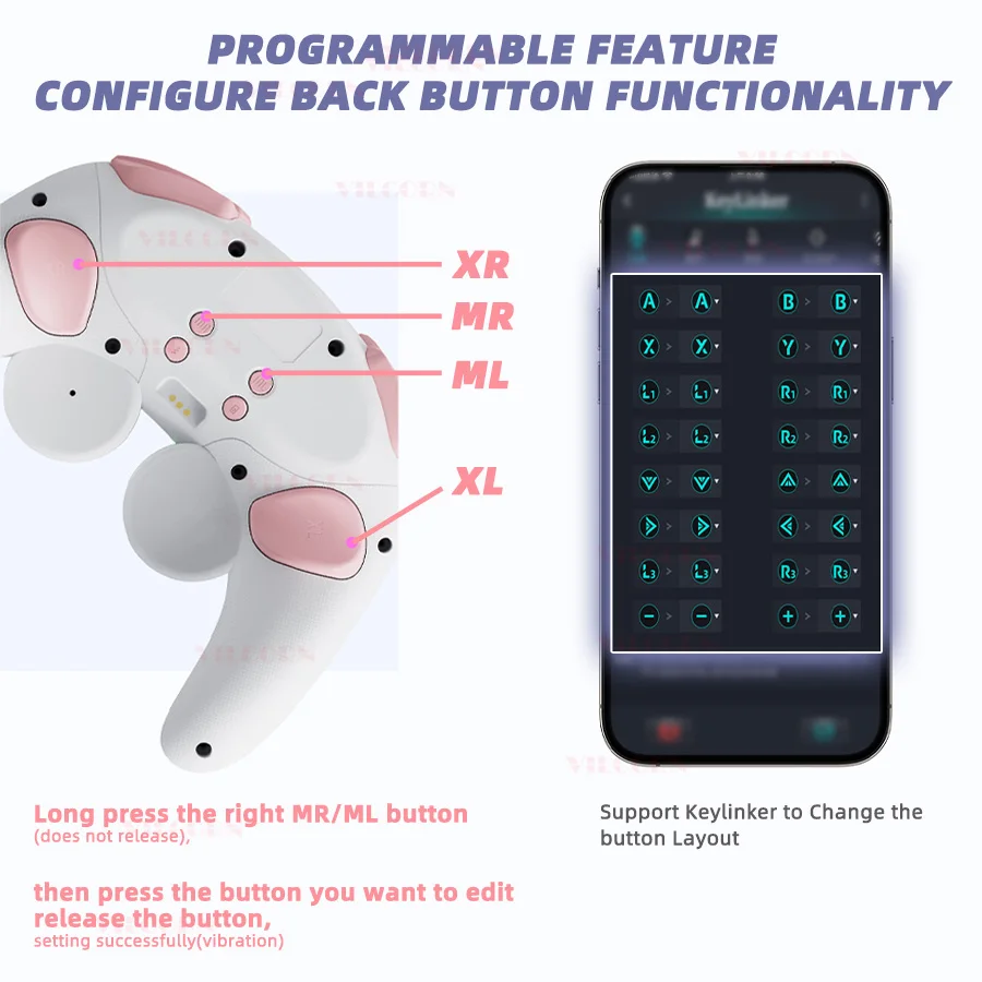 Asigne funciones personalizadas con los botones XR, MR, ML y XL usando la aplicación adjunta, lo que brinda opciones de control adicionales.