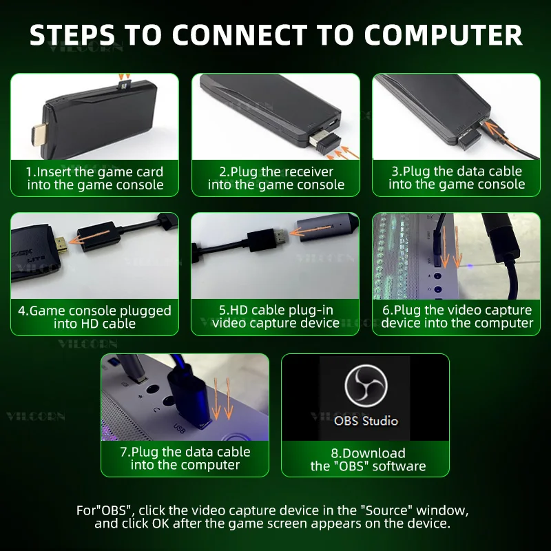 R: Debe preparar un video grabber usted mismo (no incluido en el pedido), el game stick debe estar conectado al grabber y luego abrir el software OBS en su computadora e iniciarlo.