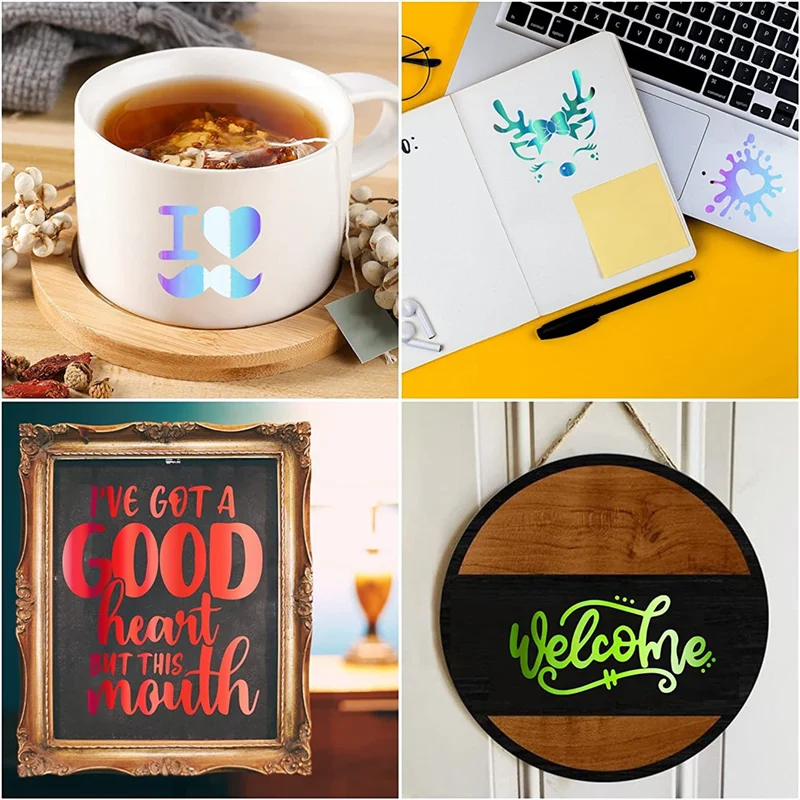 Múltiples opciones de decoración: los vinilos de cambio de temperatura con hermosos colores y diseños atractivos son perfectos para decoraciones de interiores, como su teléfono, computadora, pared, tazas, cuadernos, puertas, letras, pancartas, rayas, calcomanías, azulejos y más. Tenga en cuenta que no se recomienda para aplicaciones al aire libre debido a la decoloración UV. Simplemente estimula completamente tu imaginación y diviértete mucho con el bricolaje.