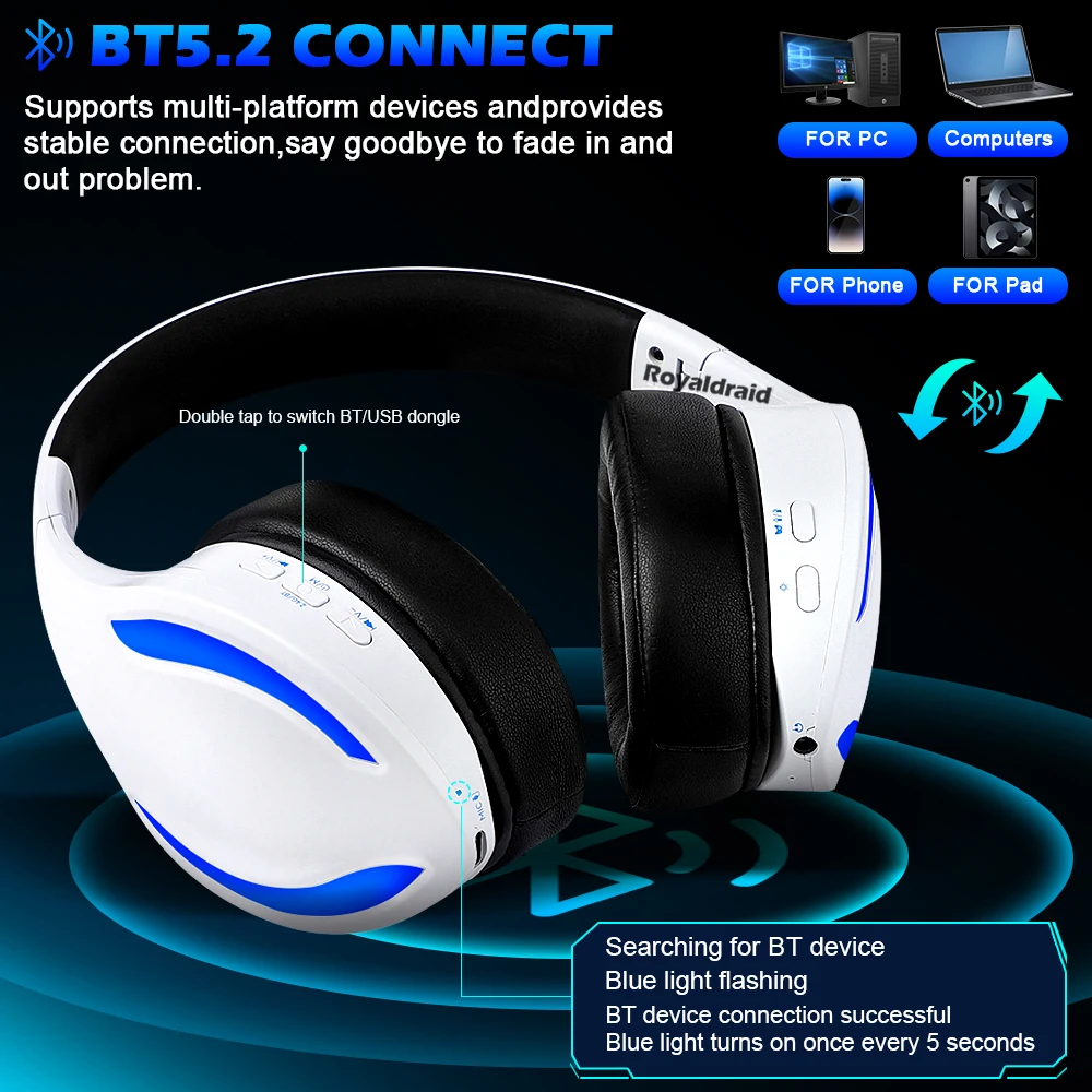 Conecte fácilmente sus dispositivos a través de BT inalámbrico a una PC/teléfono móvil/pad/portátil para juegos, escuchar música, películas, llamadas de voz, seminarios web y más.
