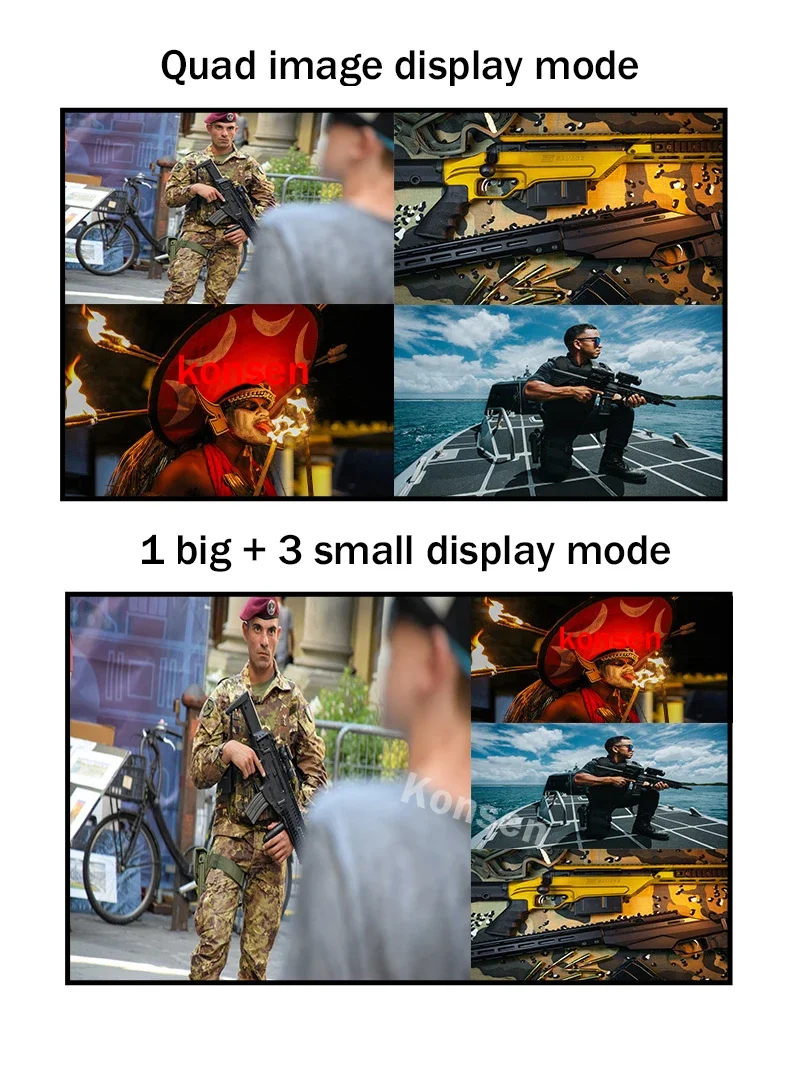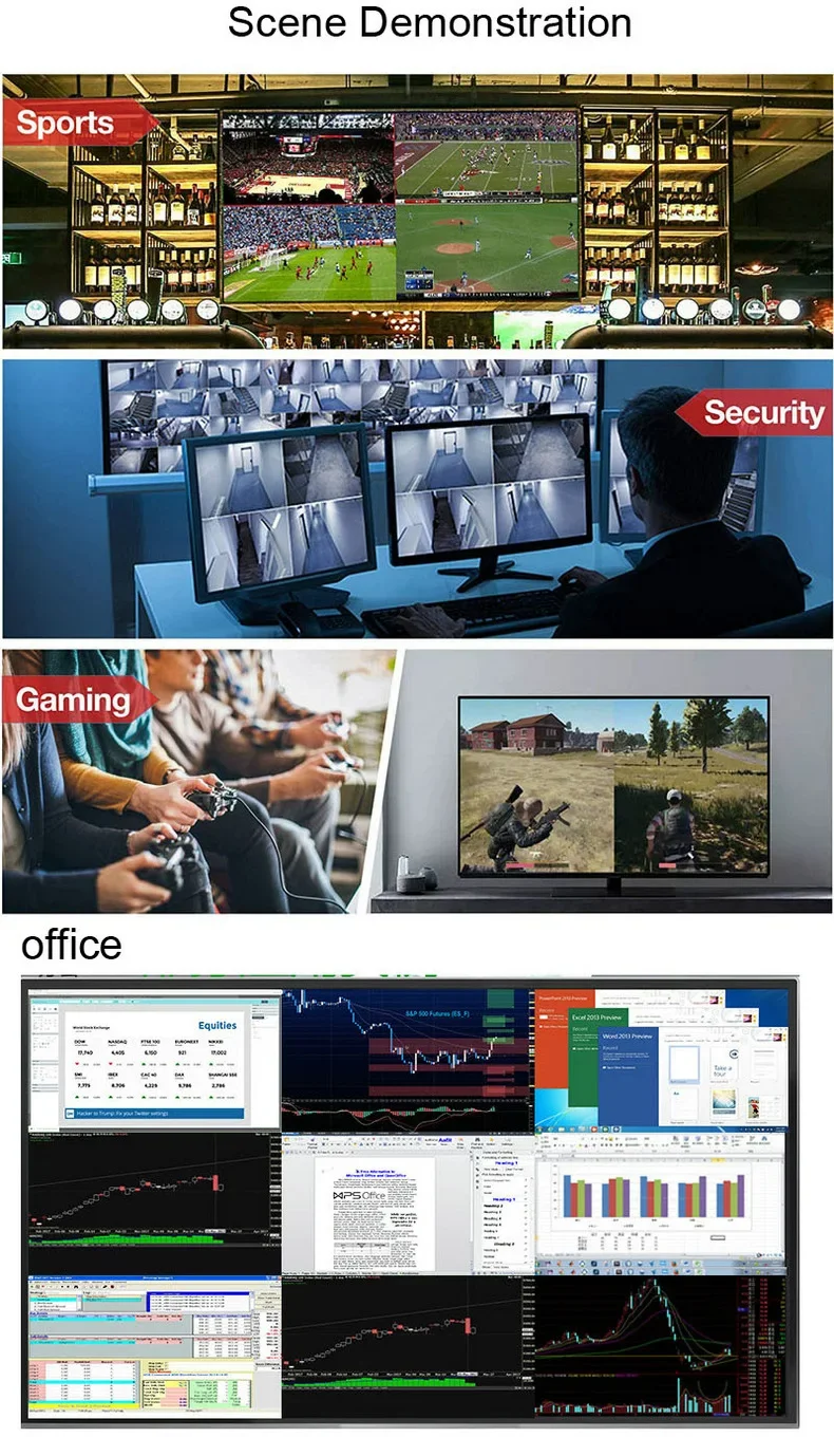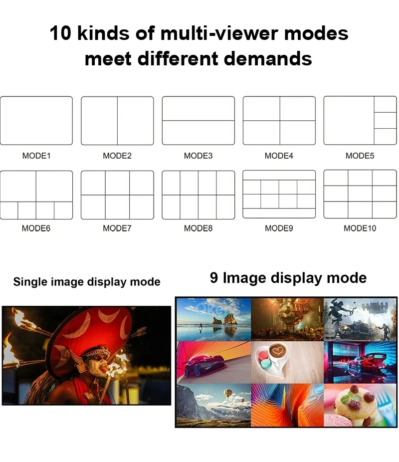 Puede mostrar 9 señales de vídeo digital HD en la misma pantalla y tiene una variedad de segmentación de vídeo, cambiando sin problemas 9 señales de entrada HD de forma sincrónica.