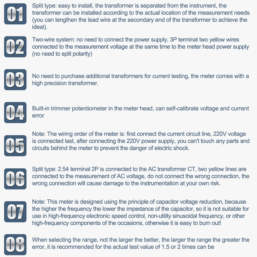 2.Tipo dividido: el terminal 2,54 2P está conectado al transformador de CA CT, las dos líneas amarillas están conectadas para medir el voltaje de CA, no conectar incorrectamente causará daños al instrumento y responsabilidad.