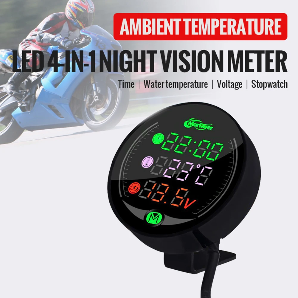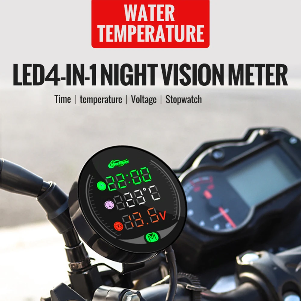 Feature: 1. Multi functional voltage, temperature, time/stopwatch display. 2. High brightness LED digital display, clearly visible both day and night. 3. The accuracy of the voltage can reach 0.1V, and it has a low voltage automatic alarm function. 4. Easy installation, strong enclosure density, waterproof and dustproof in one step. 5. DC 9-24V wide voltage range, suitable for most motorcycles. Product parameters: Input voltage: DC 9-24V Measurement range:- 20~120°C Line length: 79cm Product size: 65 * 65 * 17mm Package included: Instrument * 1 Bracket * 1 Screw package * 1