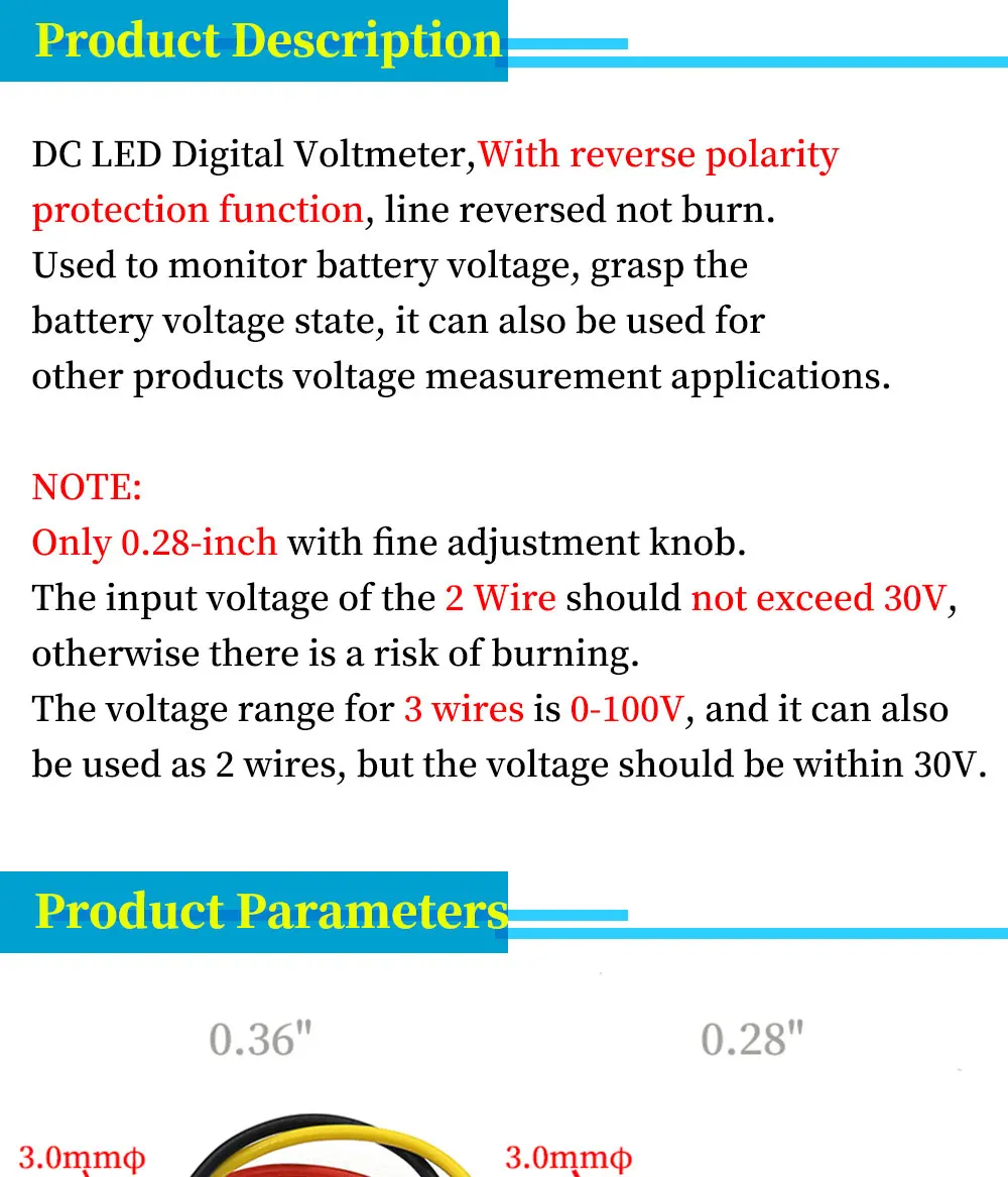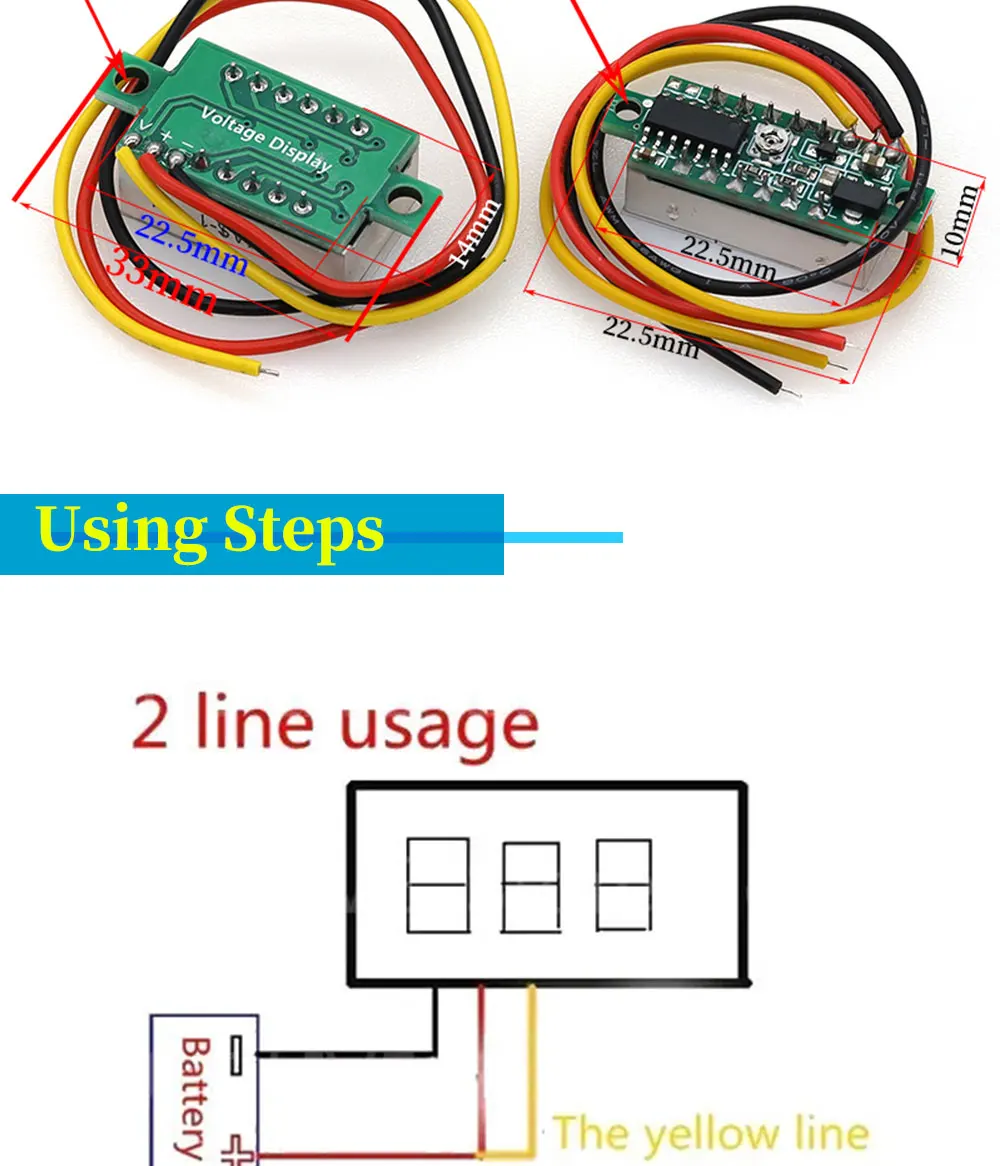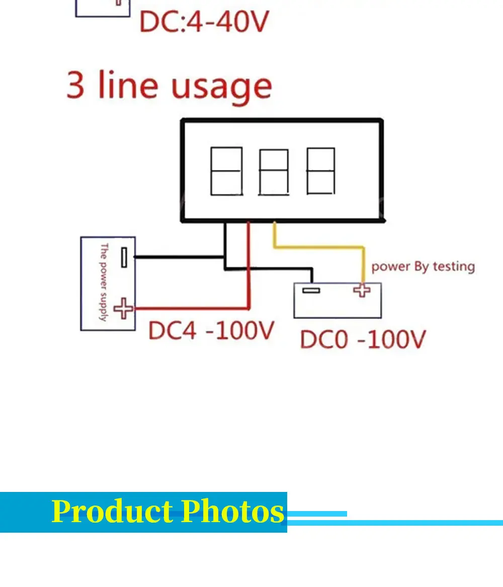 DC 0-100V, los productos de 2 y 3 cables no son universales, rompen el voltímetro convencional, V pueden trabajar directamente con 5, 9V, 12V, 24V y otros circuitos, sin estabilización de voltaje, equipado con tres cables, acceso conveniente a las líneas en el automóvil/motocicleta, con función de protección de conexión inversa, El cableado no se quemará, se utiliza para controlar el voltaje de la batería, el Estado maestro del voltaje de la batería a tiempo, también se puede utilizar para la medición, preste atención a los 2 cables El voltaje de entrada no debe exceder los 30V, de lo contrario existe el riesgo de agotamientoNota: el rango de voltaje de tres cables es 0-100V, y también se puede utilizar como dos Cables, pero el voltaje debe estar dentro de 30V