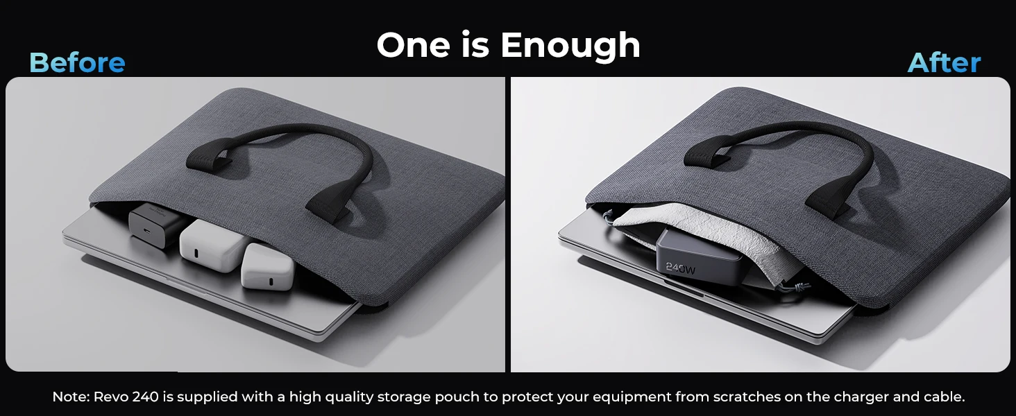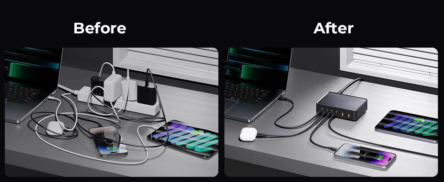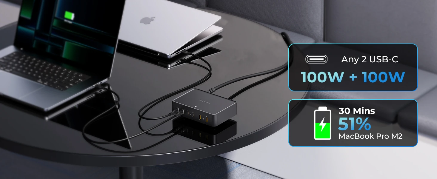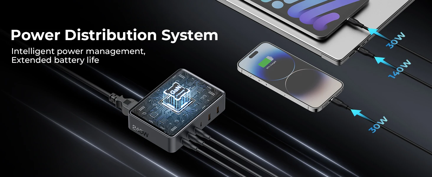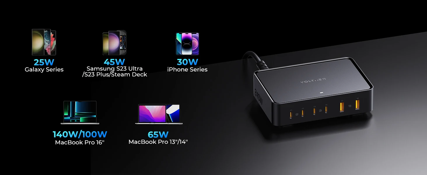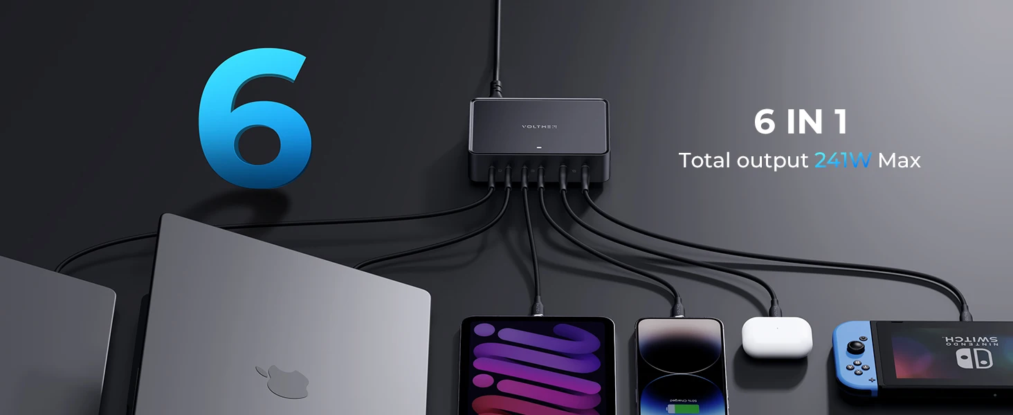 Prend en charge une sortie de 140 W sur n'importe quel port USB-C, une sortie de 200 W sur 2 ports USB-C n'importe quel, charge jusqu'à 6 appareils simultanément avec une sortie maximale de 241 W.