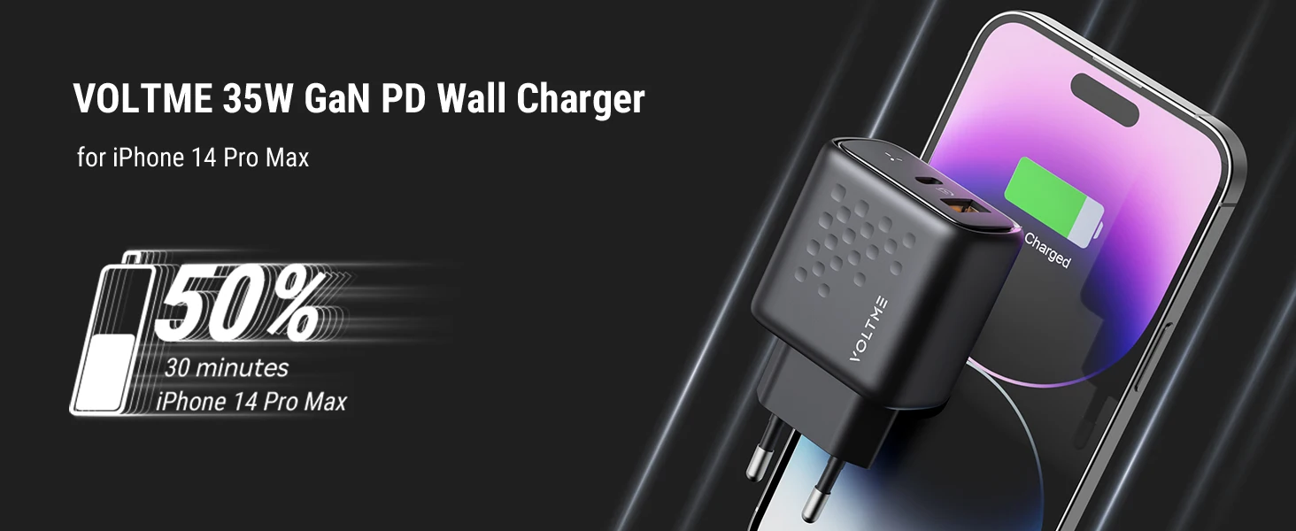 3 veces más rápido que los cargadores de pared convencionales, puedes cargar simultáneamente un iPhone 14 pro como máximo de 0% a 50% en 30 minutos