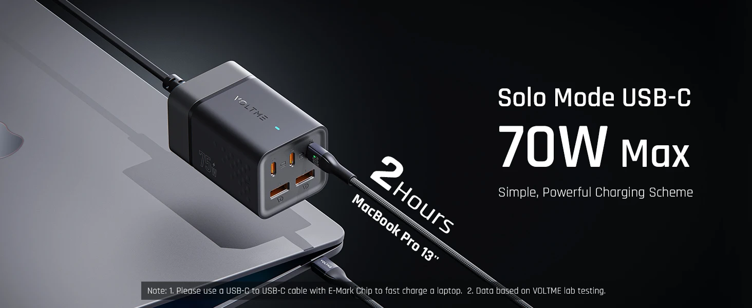 Este cargador USB C tiene una salida de un solo puerto máximo de 70 W para cada puerto de carga USB C, un cargador rápido USB C que cargará rápidamente a su MacBook Pro 13 del 0% al 100% en dos horas.