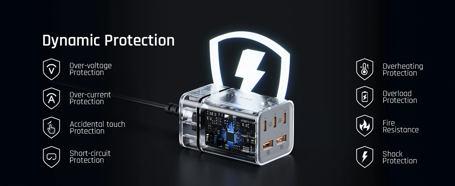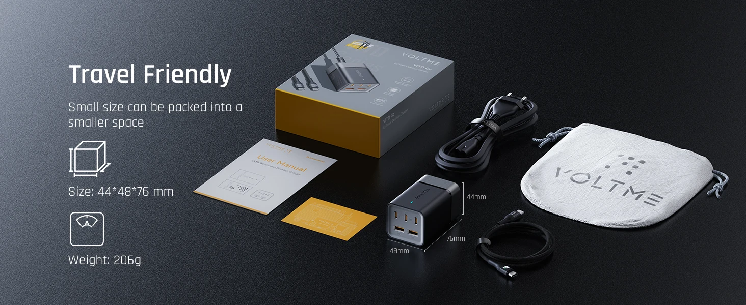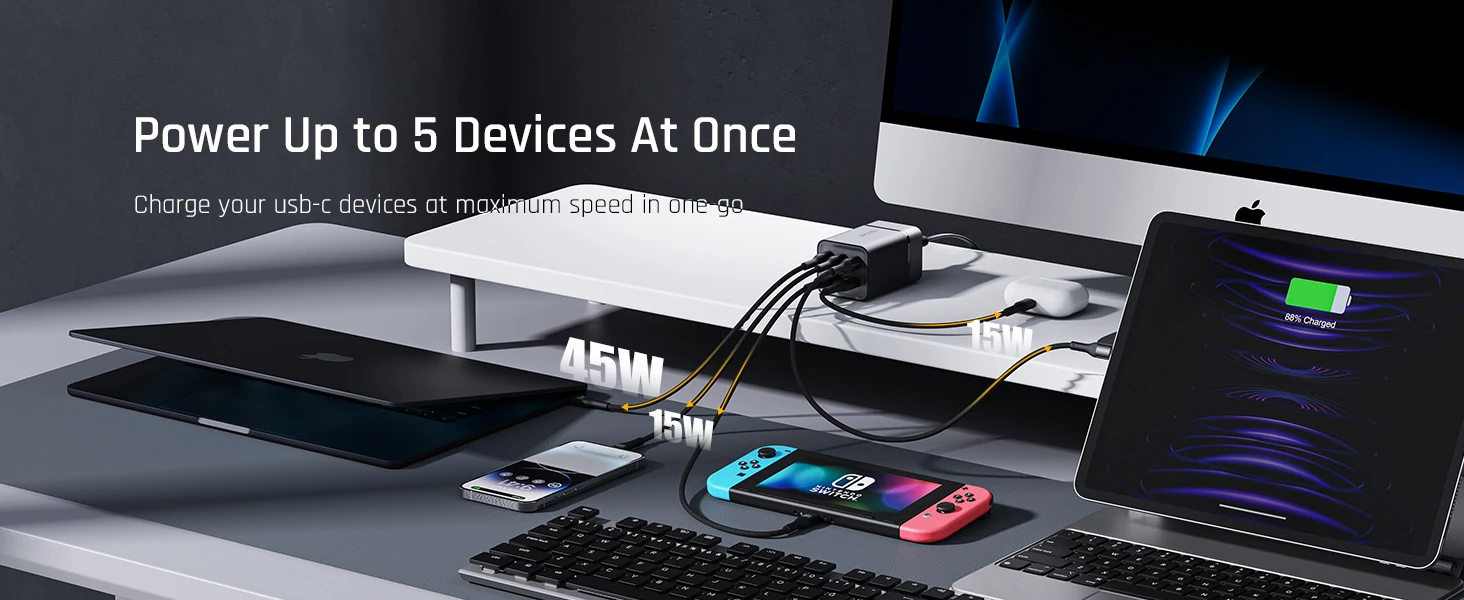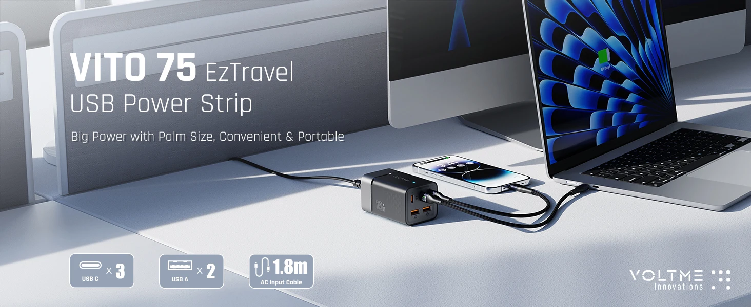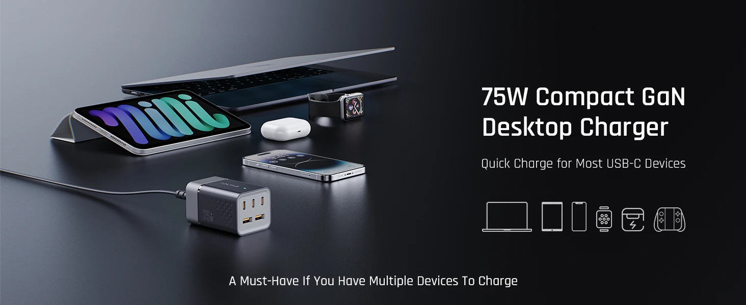 El cargador de escritorio VITO de 75 W es un 40% más pequeño en comparación con un cargador USB tipo C tradicional de 65 W.Cargue hasta 5 dispositivos simultáneamente