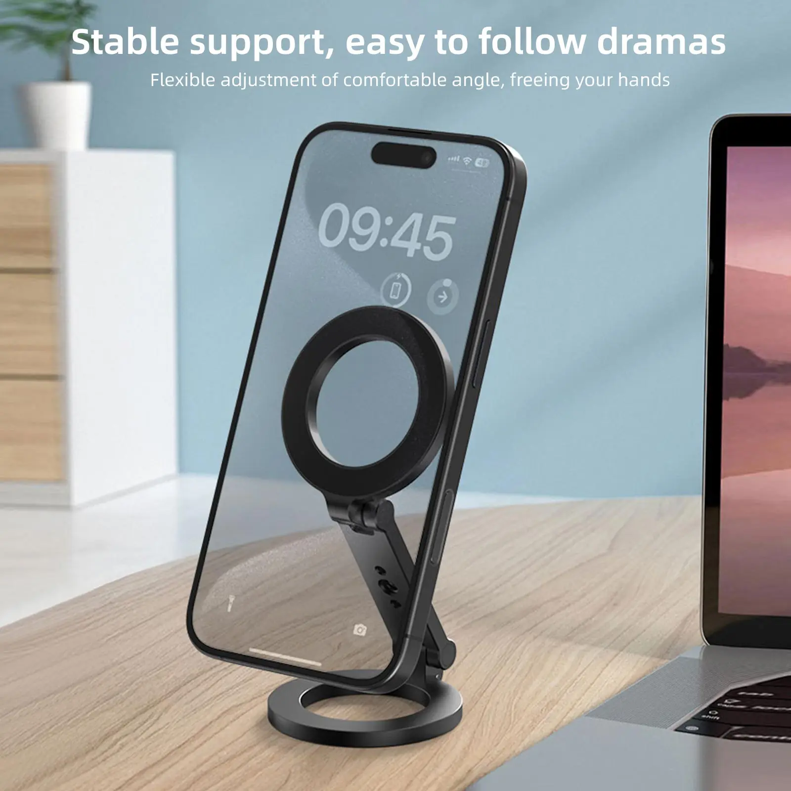 Soporte para teléfono de ajuste libre: el diseño de 2 ejes giratorios permite ajustar este soporte magnético para teléfono celular en múltiples dimensiones, incluido cualquier ángulo y altura adecuada.Puede cambiar fácilmente entre pantallas horizontales y verticales del teléfono móvil, satisfaciendo sus diversas necesidades, como ver programas de televisión, ver videos, fotografiar teléfonos, videos telefónicos, realizar videollamadas y leer.