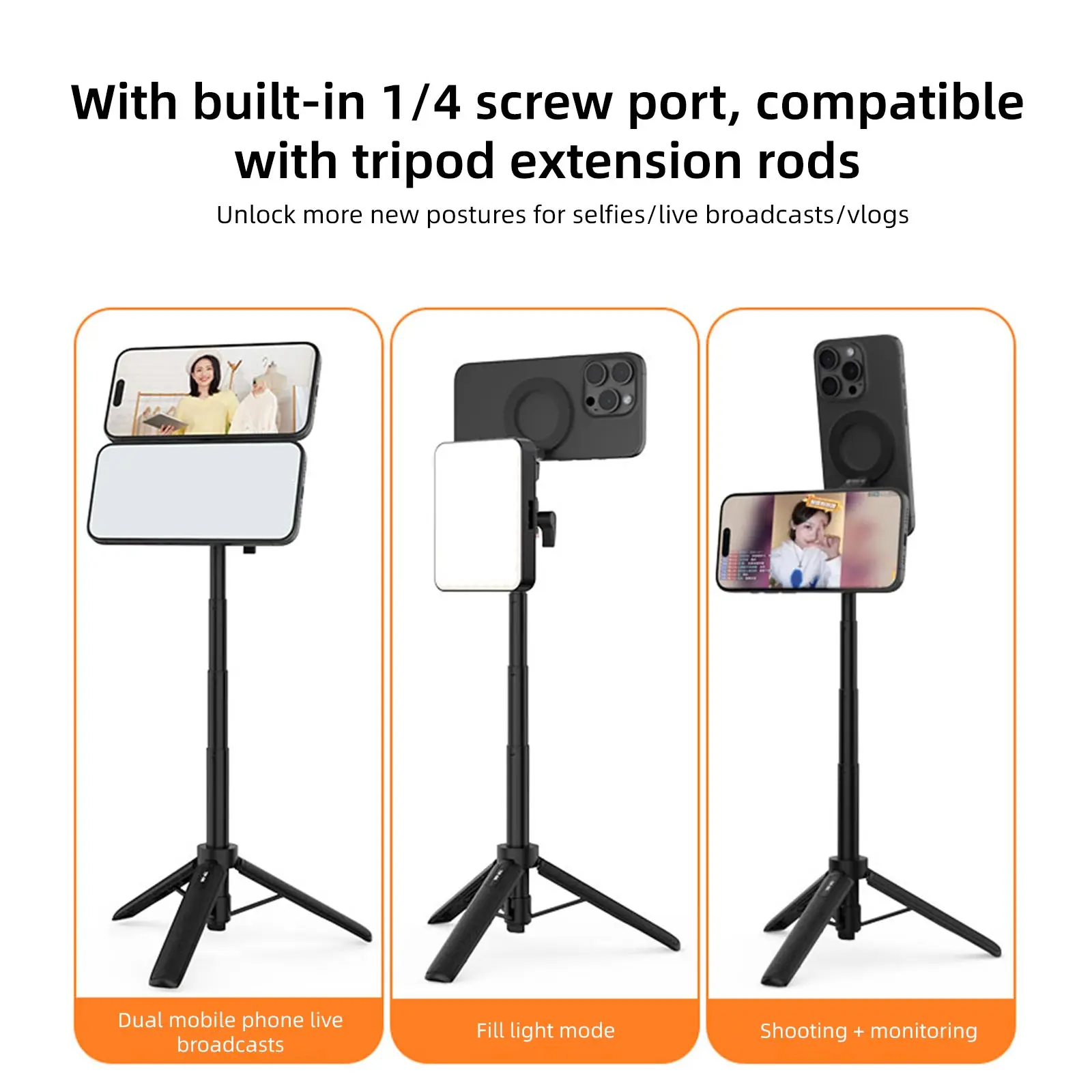 1/4;-20 Soporte para trípode para teléfono: este soporte para trípode para teléfono tiene 1/4; Orificio para tornillos y zapata fría que es compatible con trípodes, luces para selfies, luces de relleno y luces anulares, lo que hace que la instalación sea rápida y sencilla.Simplemente apriete el soporte magnético del teléfono del trípode al tornillo y listo.