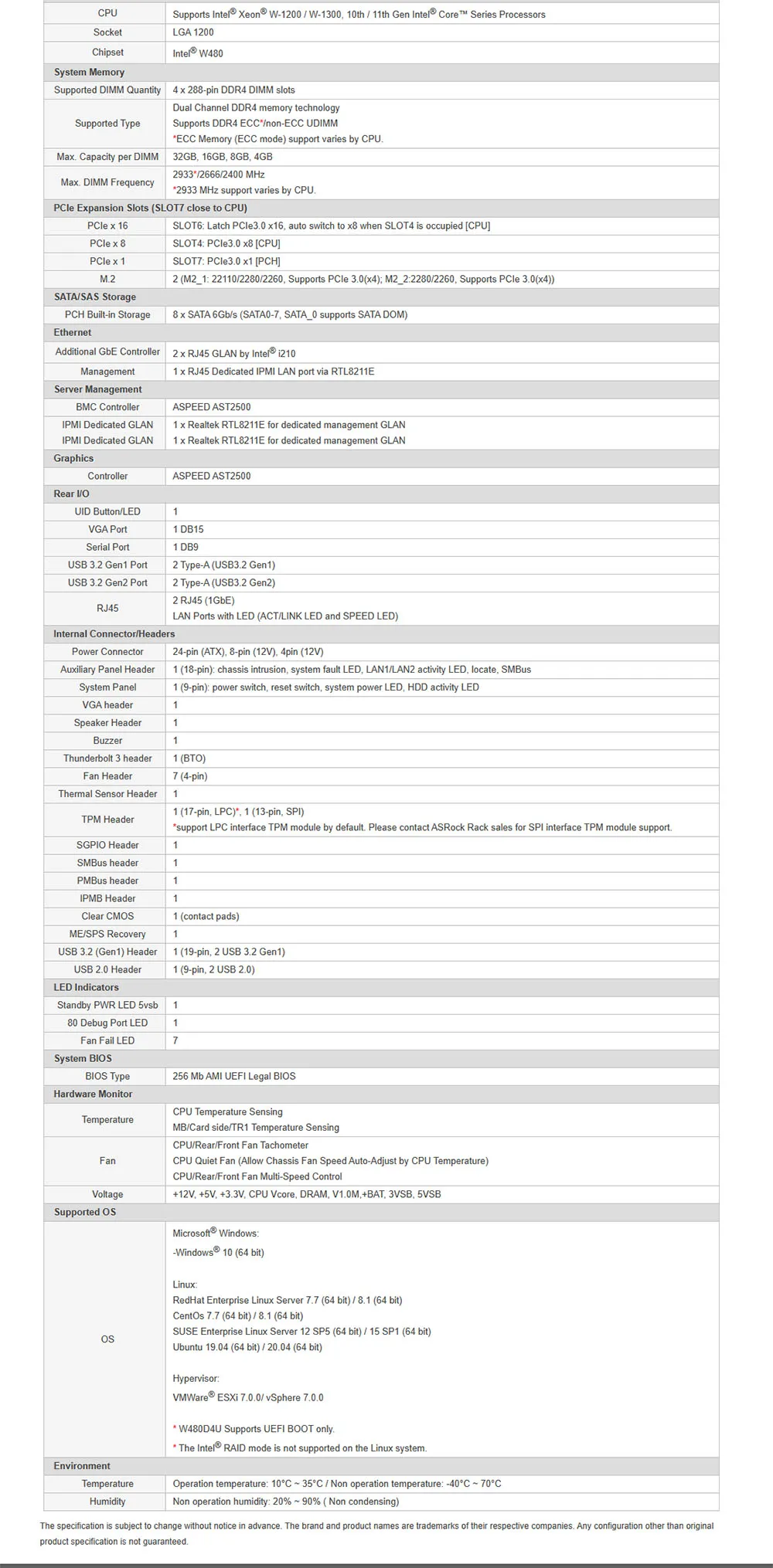 W480D4U para placa base de servidor ASRock Rack DDR4 ECC LGA1200 compatible con Core10/11 W-1200 1300