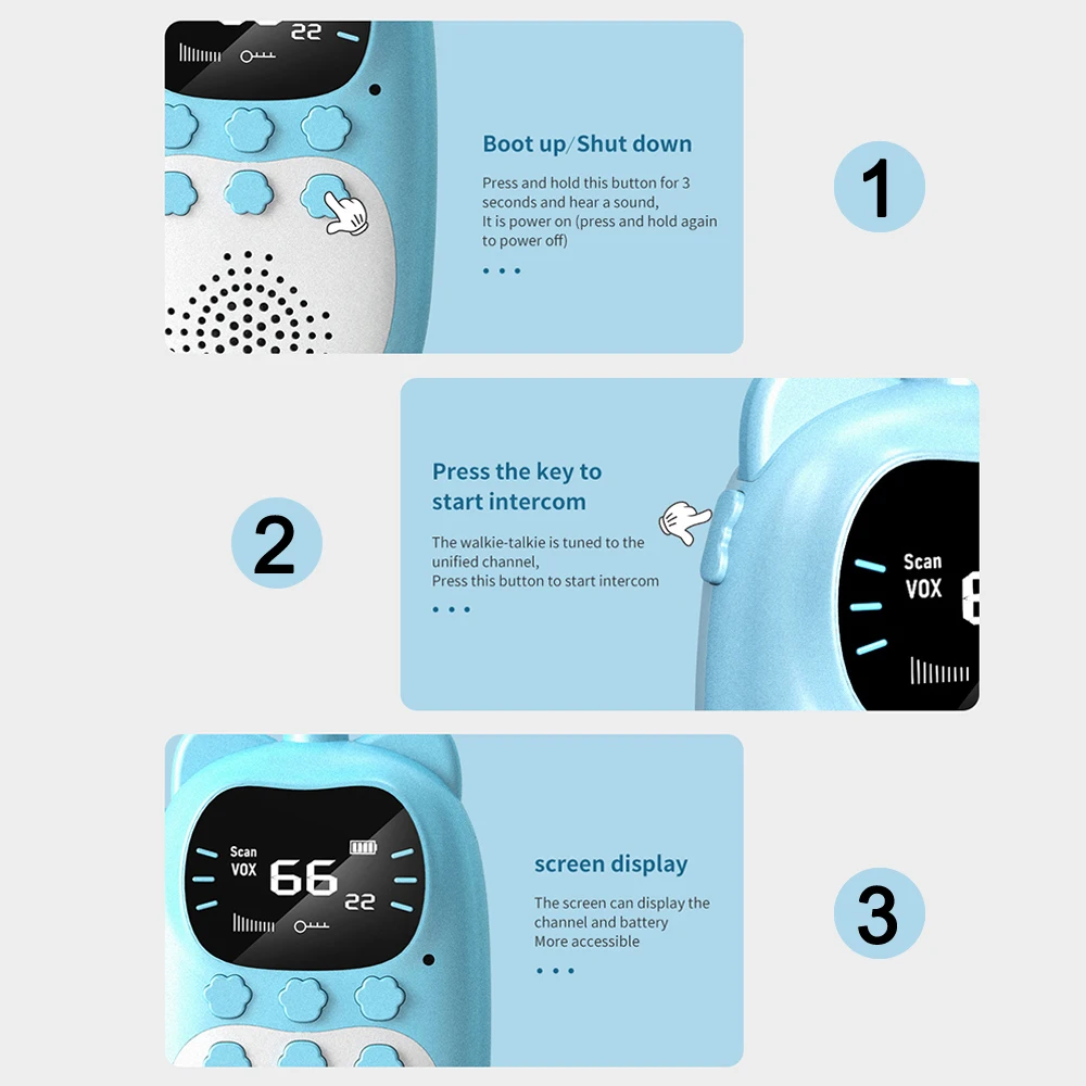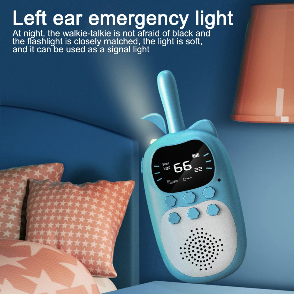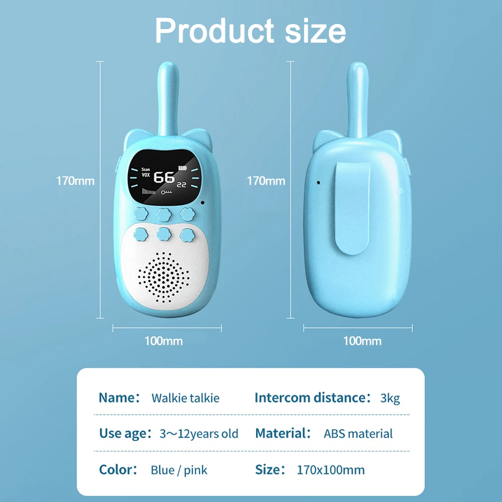 1.Los walkie talkies para niños modernos y de colores brillantes son muy apreciados tanto por niños como por niñas.100% seguro para que lo usen los niños.Se puede utilizar tanto en interiores como en exteriores.