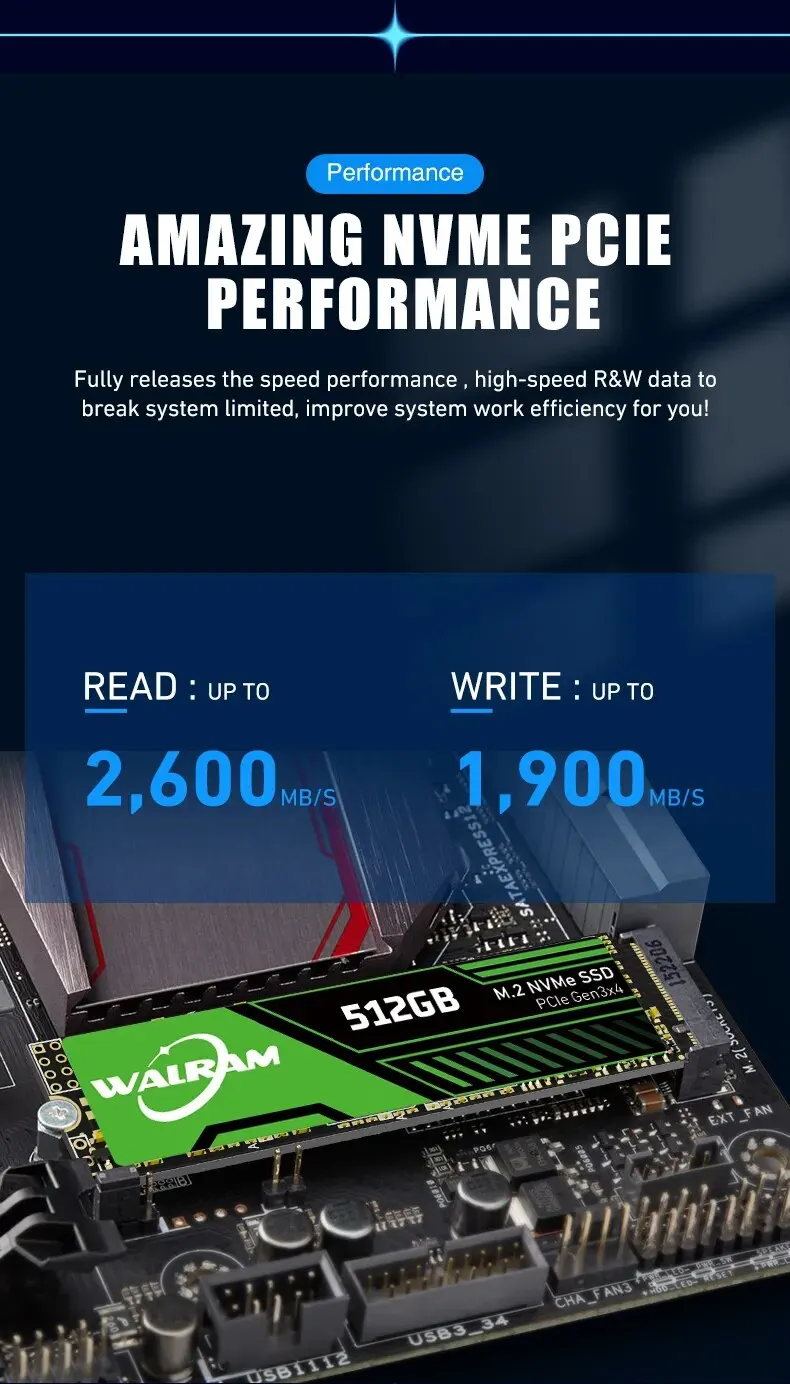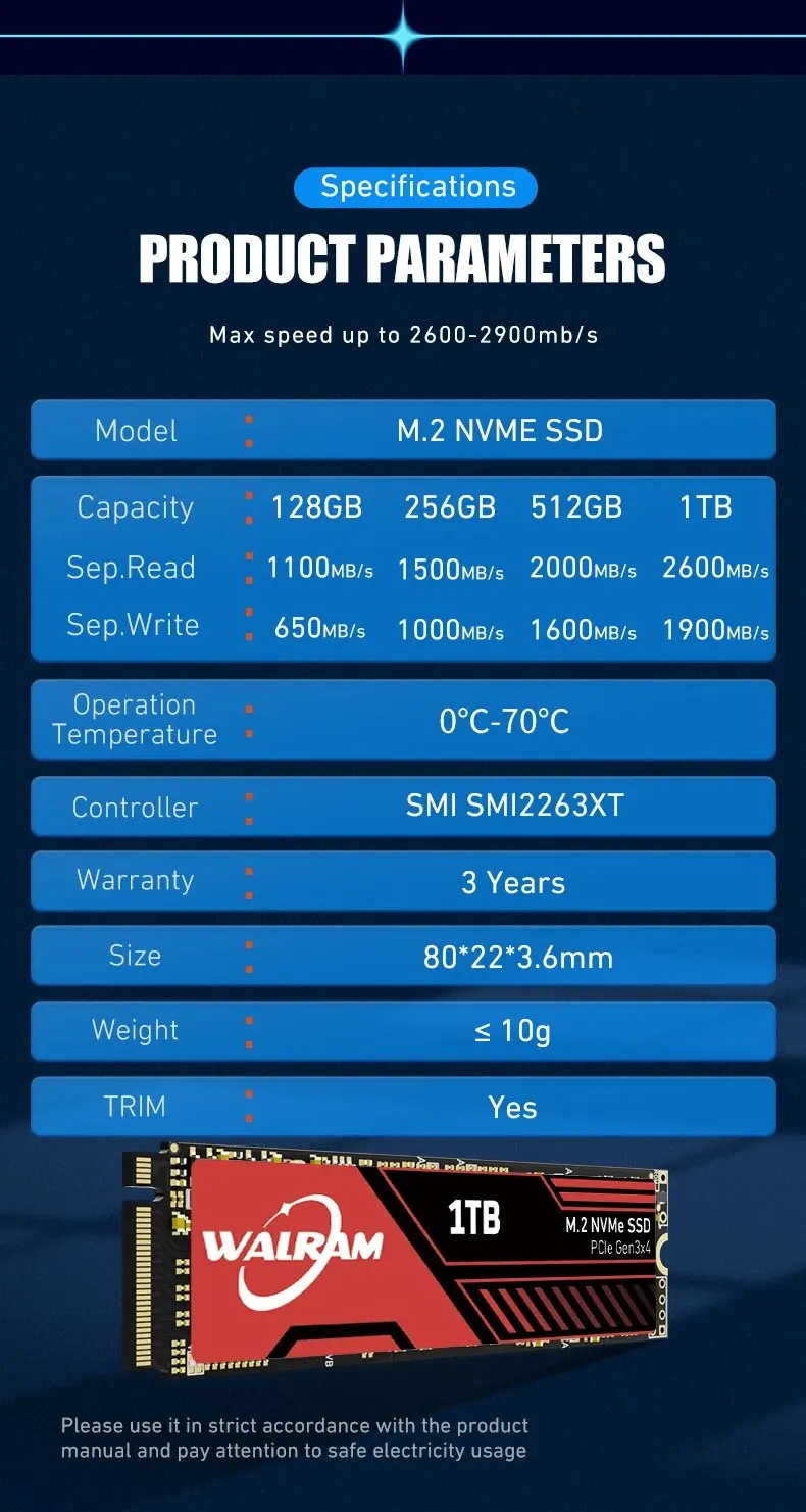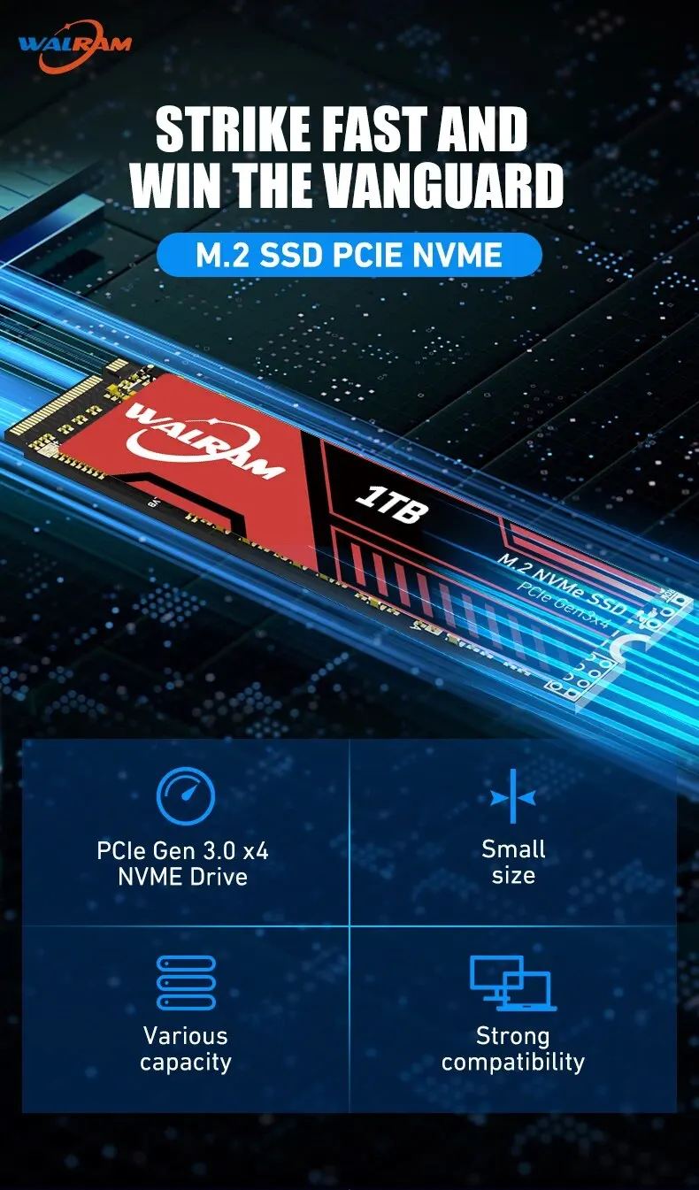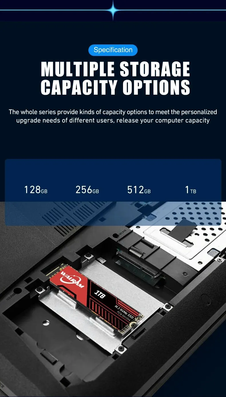 • Protocolo de transporte NVME:Con el protocolo de transporte NVME, El WALRAM m2 x 128GB 256GB 512GB 1TB SSD Hard Drive proporciona velocidades de transferencia de datos más rápidas y eficiencia energética mejorada.