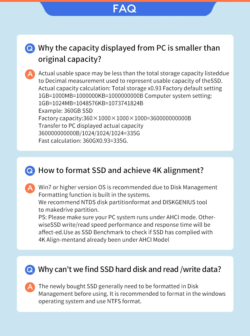 P: Se recomienda Win7 o una versión superior del sistema operativo debido a la función de formateo de Administración de discos incorporada en los sistemas. Recomendamos NTDS disco partitionformat y herramienta DISKGENIUS para hacer la unidad de partición. PS: Por favor, asegúrese de que su sistema de PC se ejecuta bajo el modo AHCI.